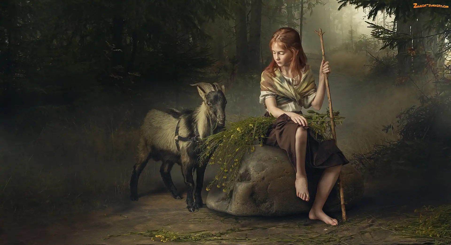 Zdjęcie: Las, Dziewczynka, Mgła, Kwiaty, Koza, Kamień