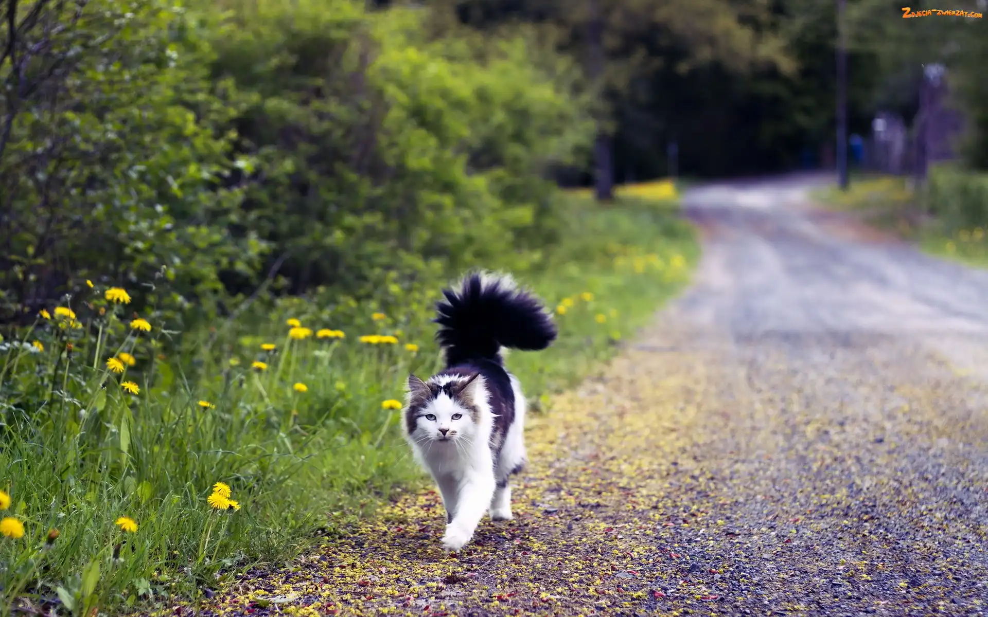 Zdjęcie: Puszysty, Mlecze, Ogon, Biało, Żółte, Droga, Kot, Czarny, Las