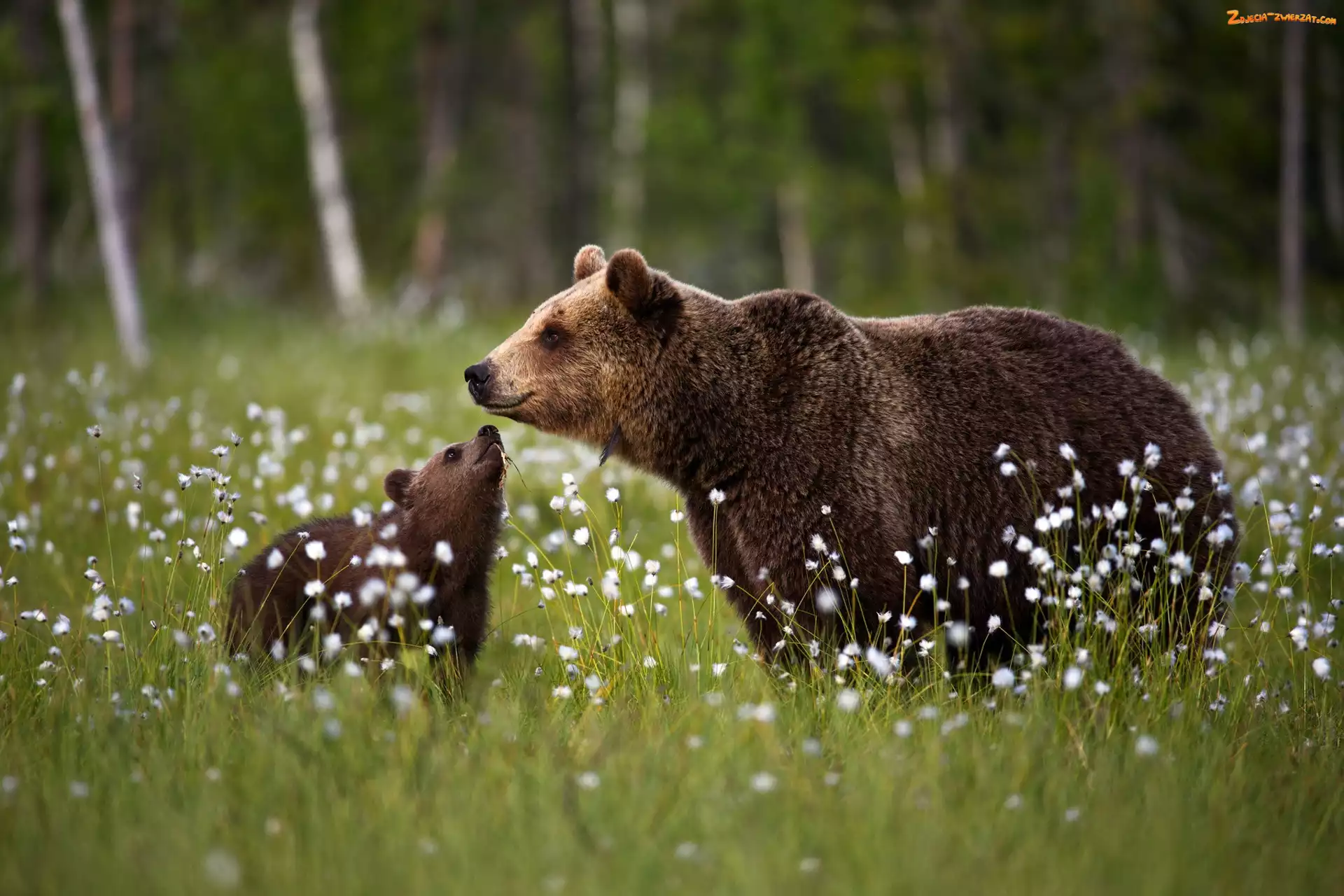 Zdjęcie: Polana, Las, Niedźwiadek, Niedźwiedź brunatny, Drzewa, Kwiatki