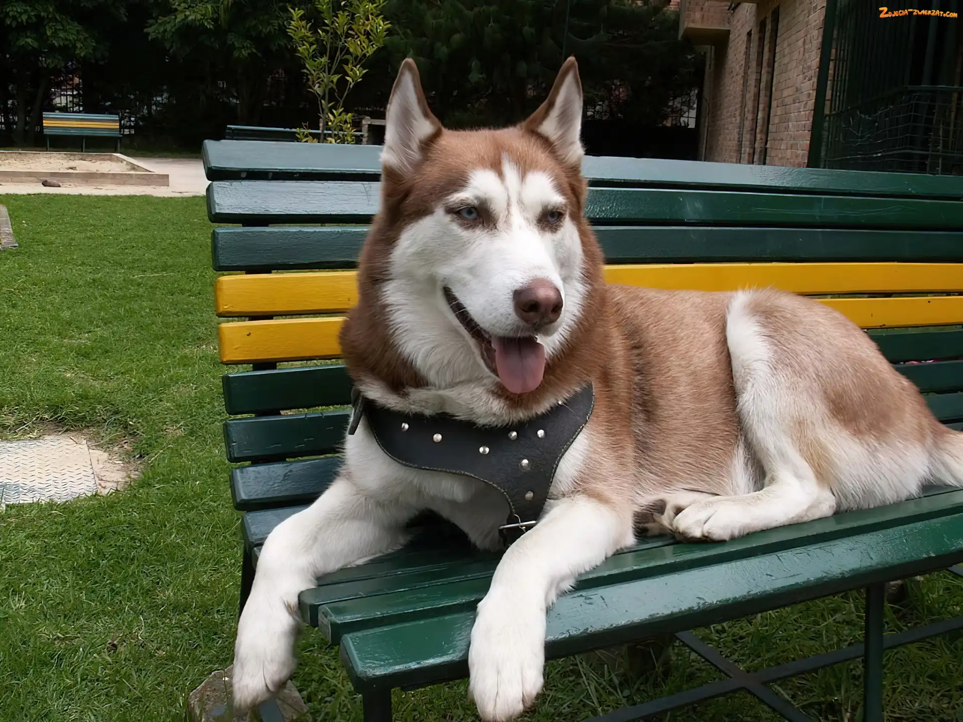 Zdjęcie: ławka, Siberian Husky, zielono-żółta