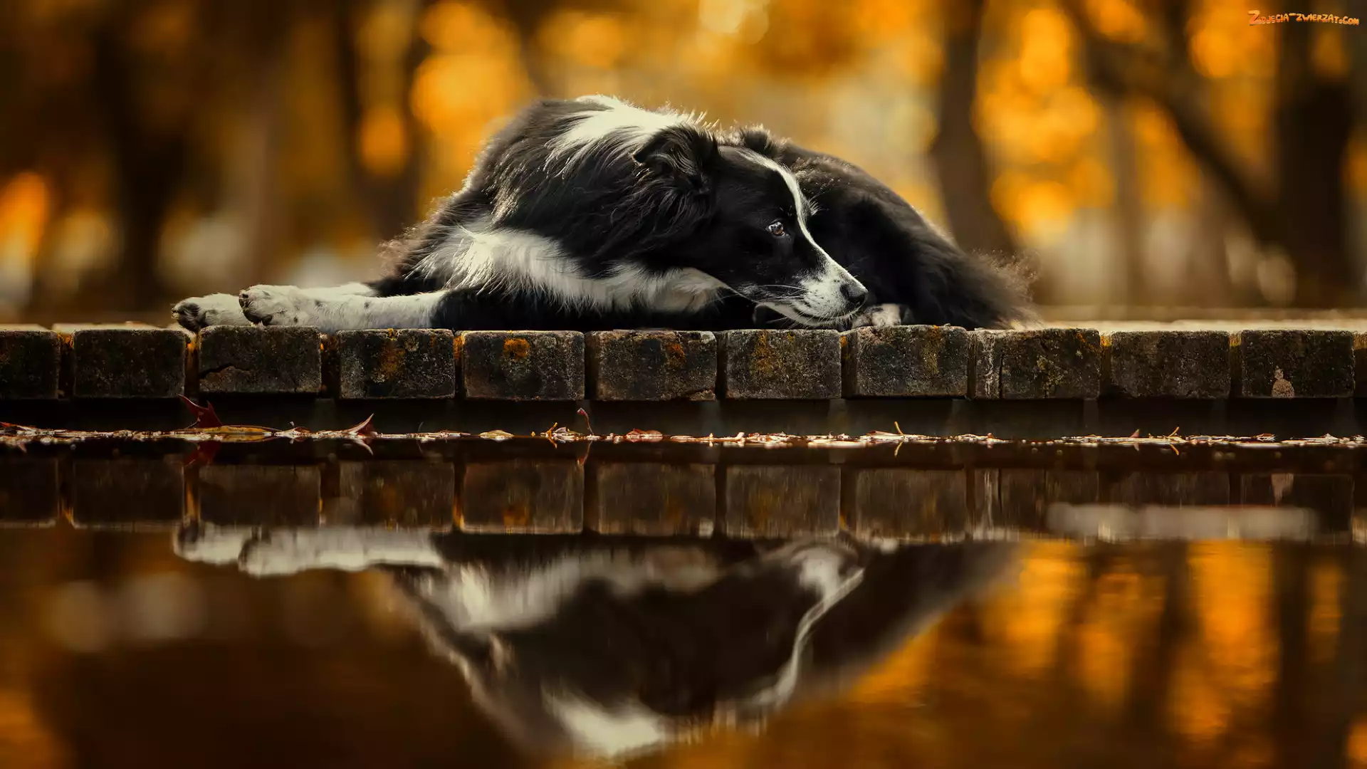 Zdjęcie: Pies, Leżący, Odbicie, Murek, Biało-czarny, Border collie