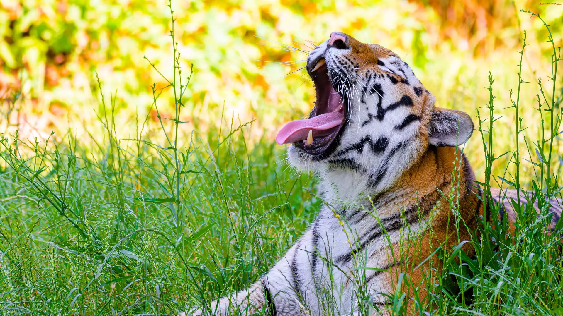 Zdjęcie: Ziewający, Tygrys, Trawa, Leżący