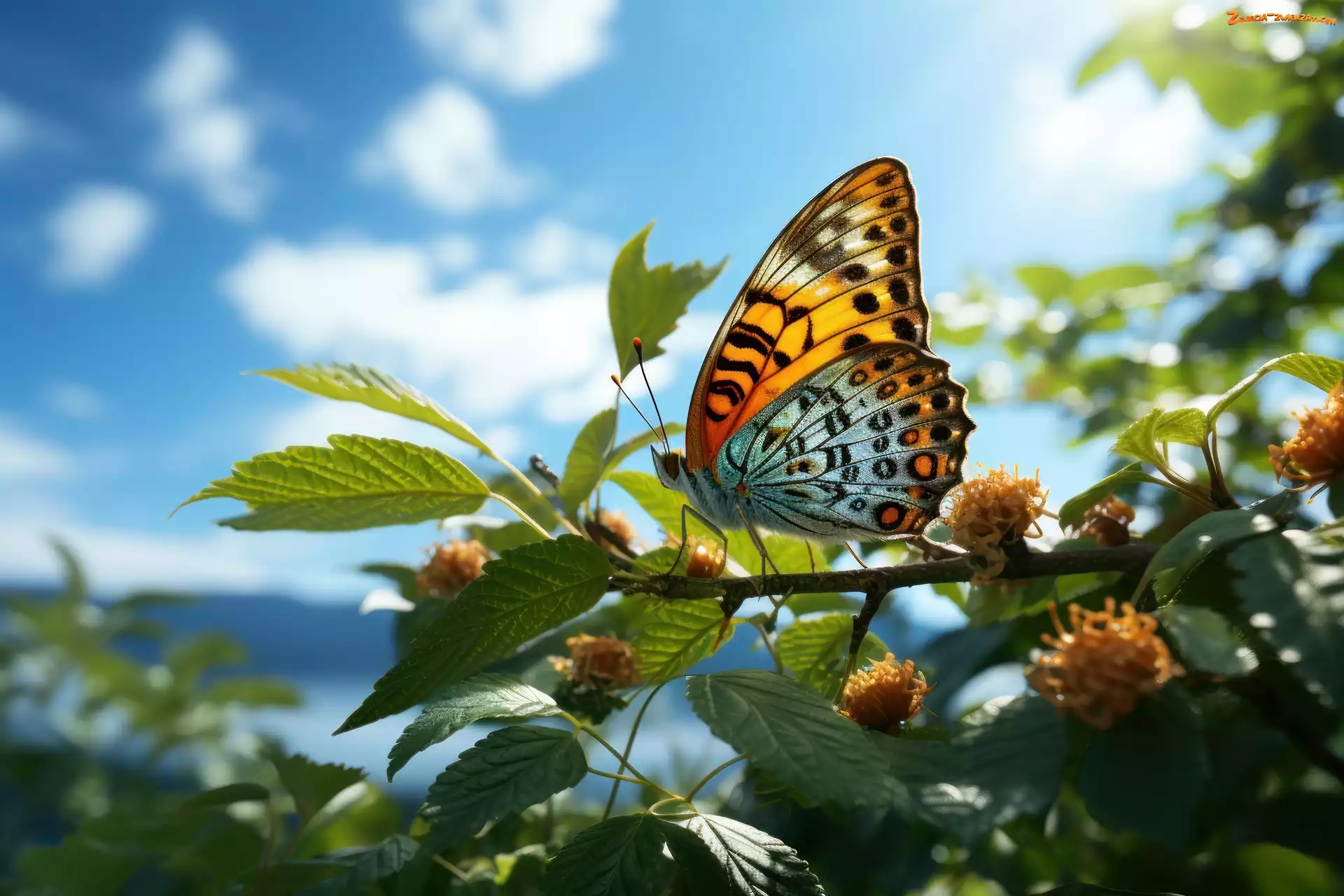 Zdjęcie: Niebo, Liście, Grafika, Motyl, Gałąź