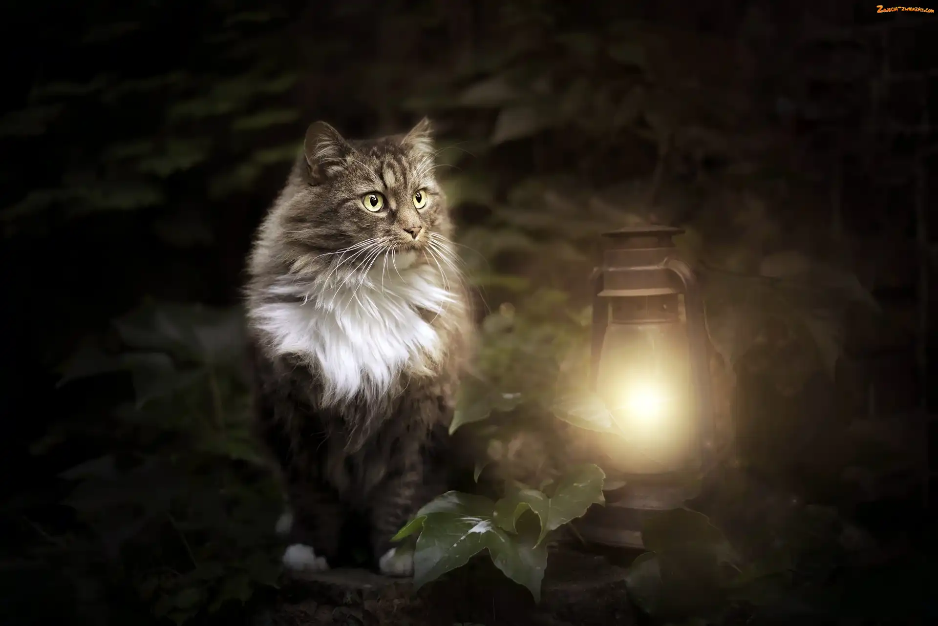 Zdjęcie: Liście, Kot, Lampa naftowa