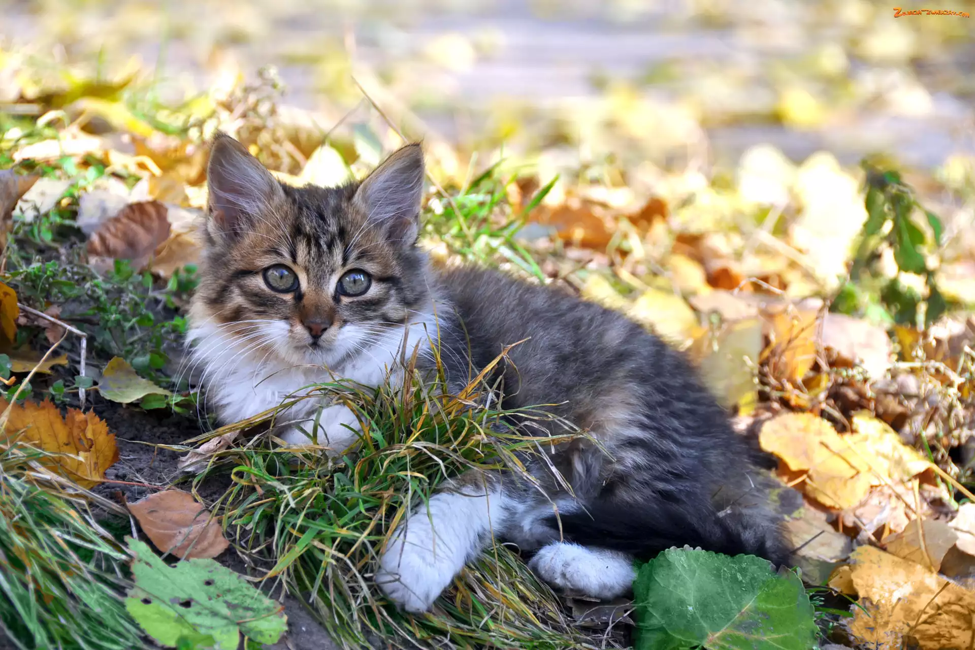 Zdjęcie: Leżący, Kot, Trawa, Liście