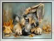 Grafika AI, Pies, Owczarek niemiecki, Szczeniak, Suche, Liście