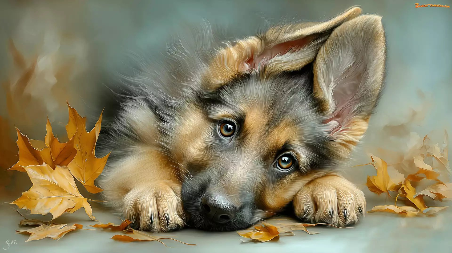 Zdjęcie: Grafika AI, Pies, Owczarek niemiecki, Szczeniak, Suche, Liście