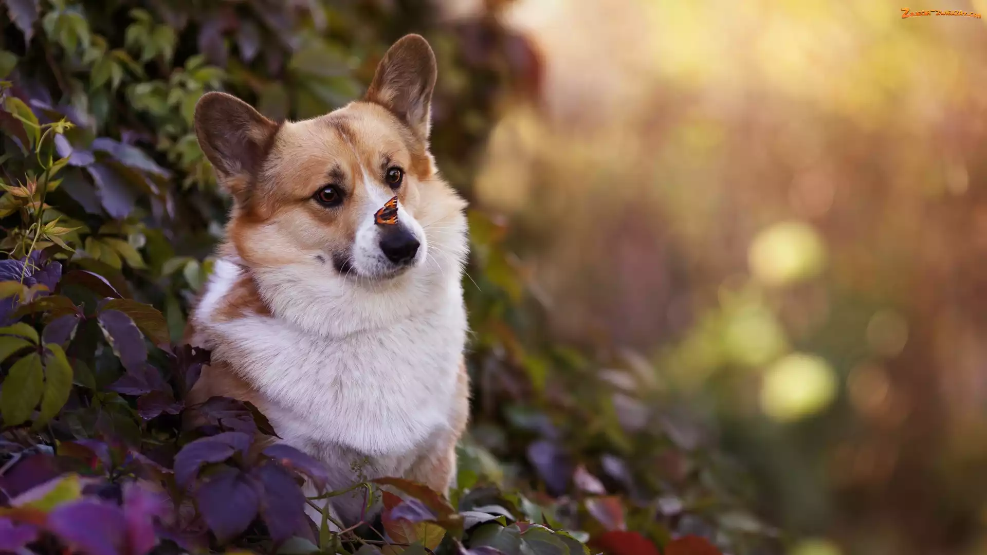 Zdjęcie: Liście, Welsh corgi pembroke, Rudo-biały, Pies, Motyl, Fioletowe