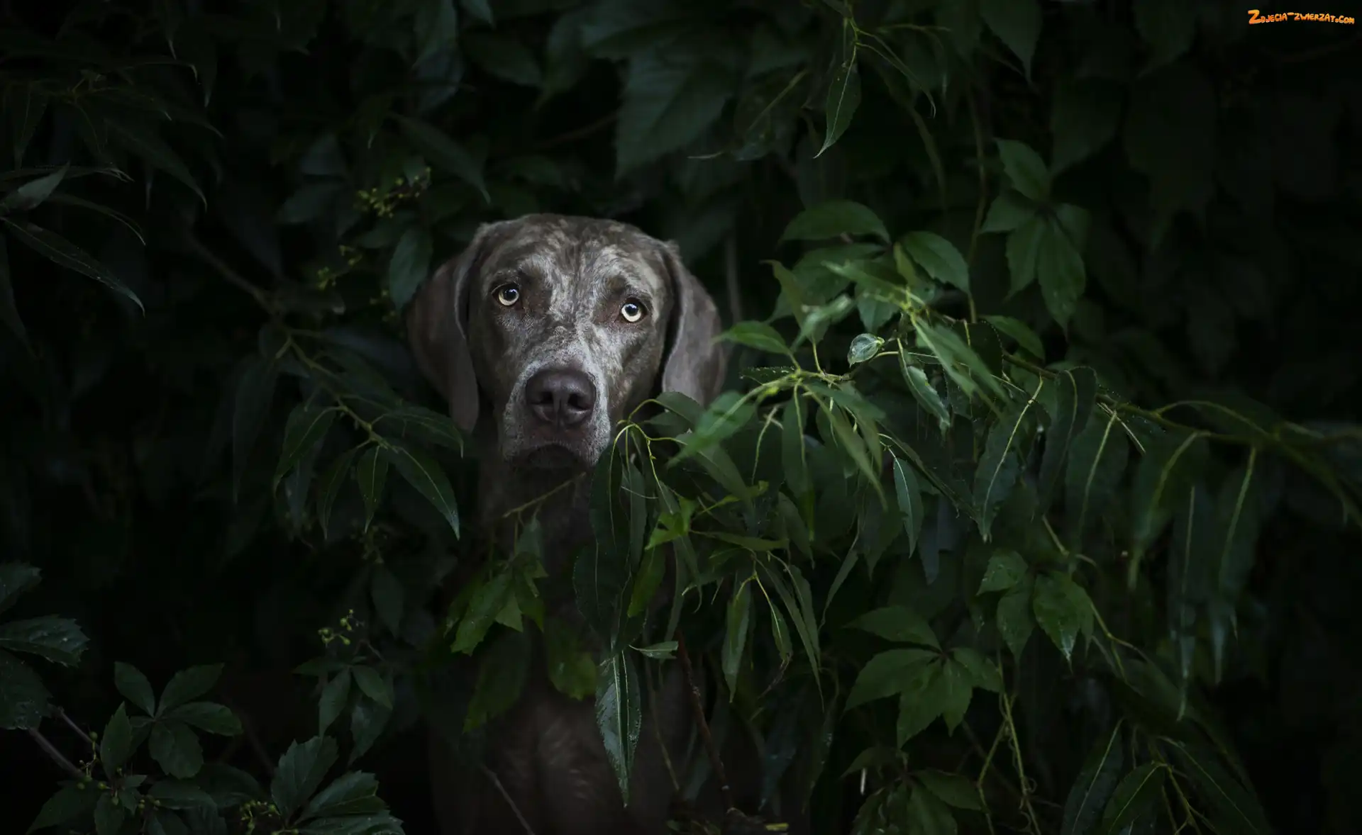Zdjęcie: Liście, Zarośla, Wyżeł weimarski, Pies, Głowa