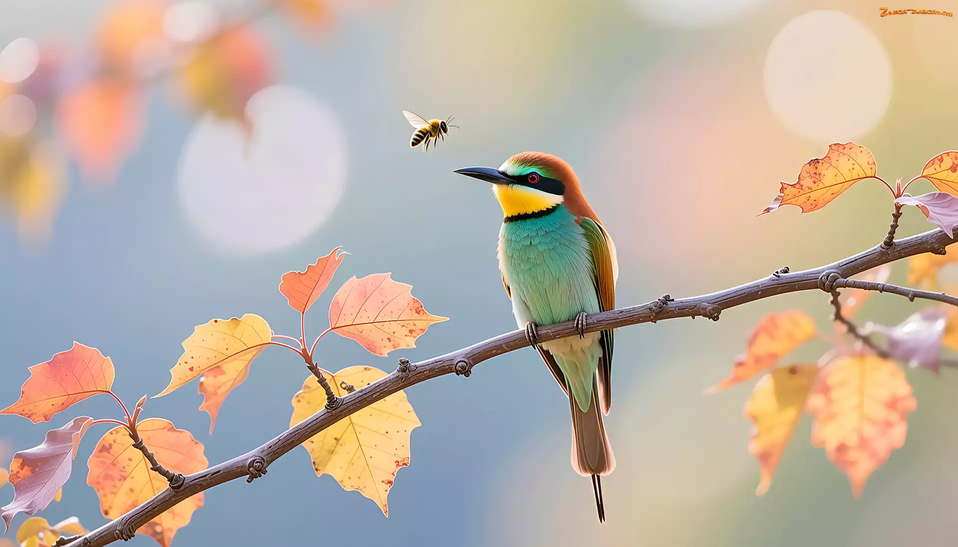 Zdjęcie: Jesienne, Żołna, Ptak, Gałązka, Grafika AI, Pszczoła, Liście