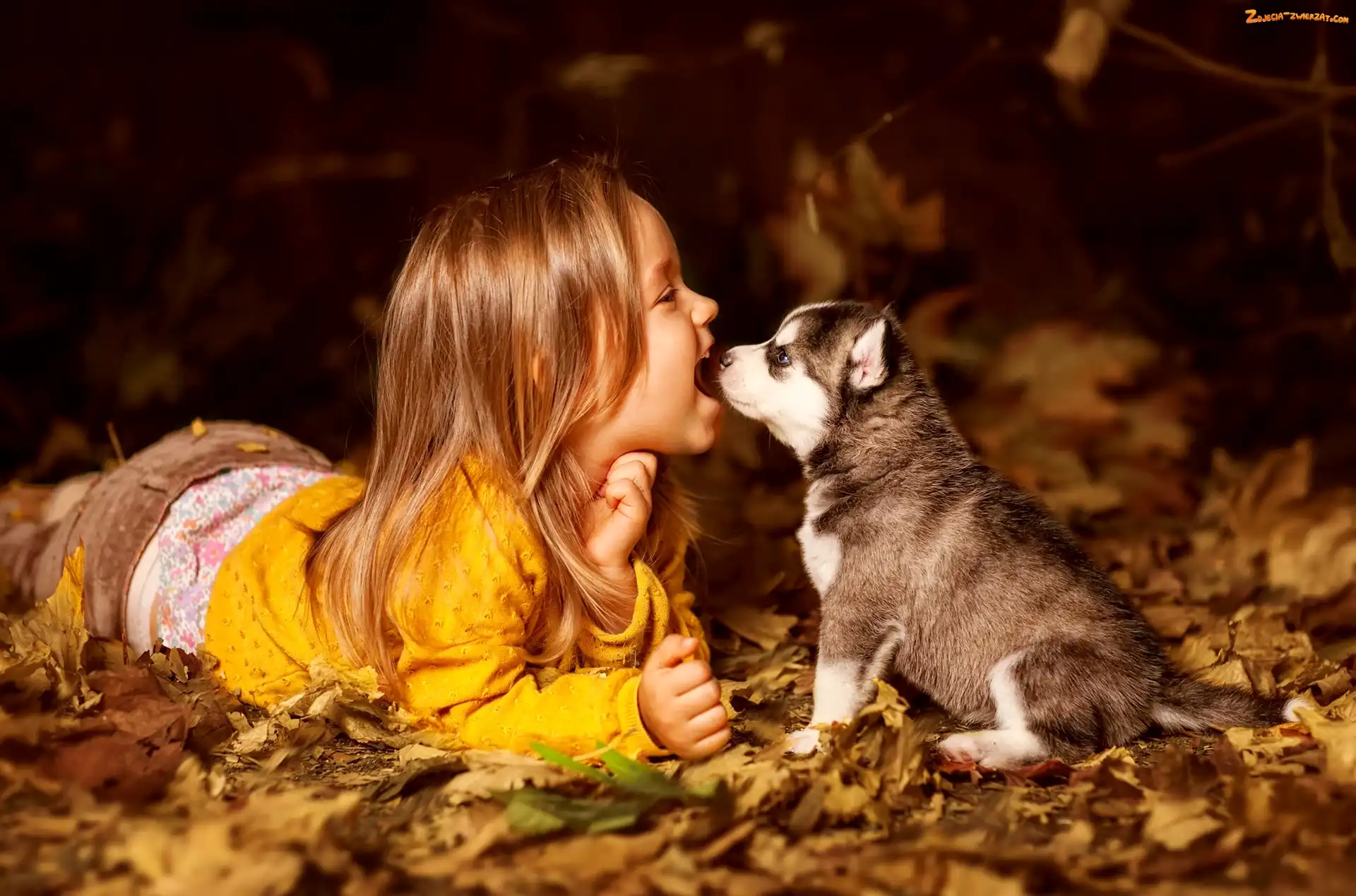 Zdjęcie: Liście, Żółte, Szczeniak, Dziewczynka, Siberian husky