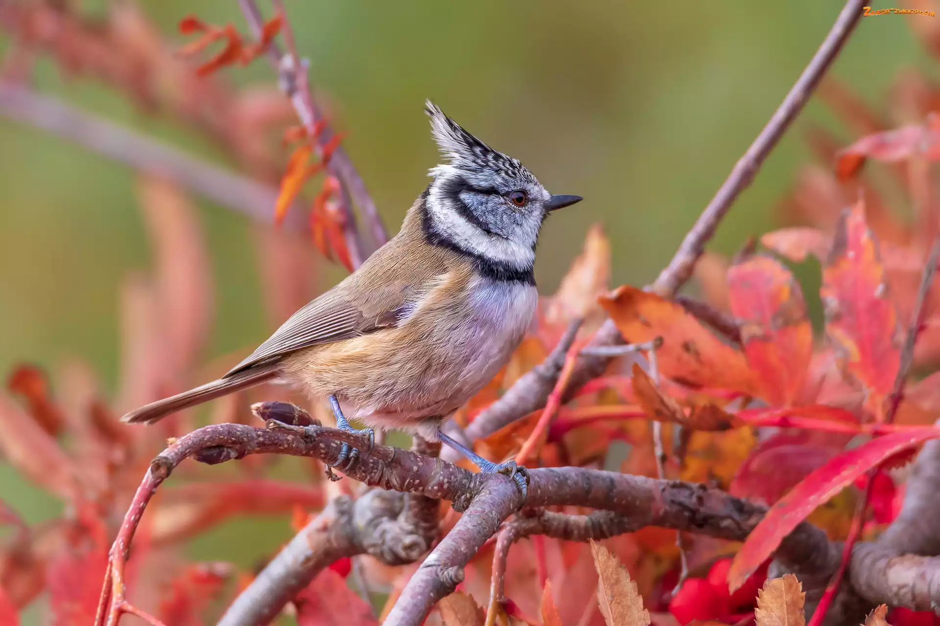 Zdjęcie: Gałęzie, Czubatka europejska, Liście, Ptak, Sikora