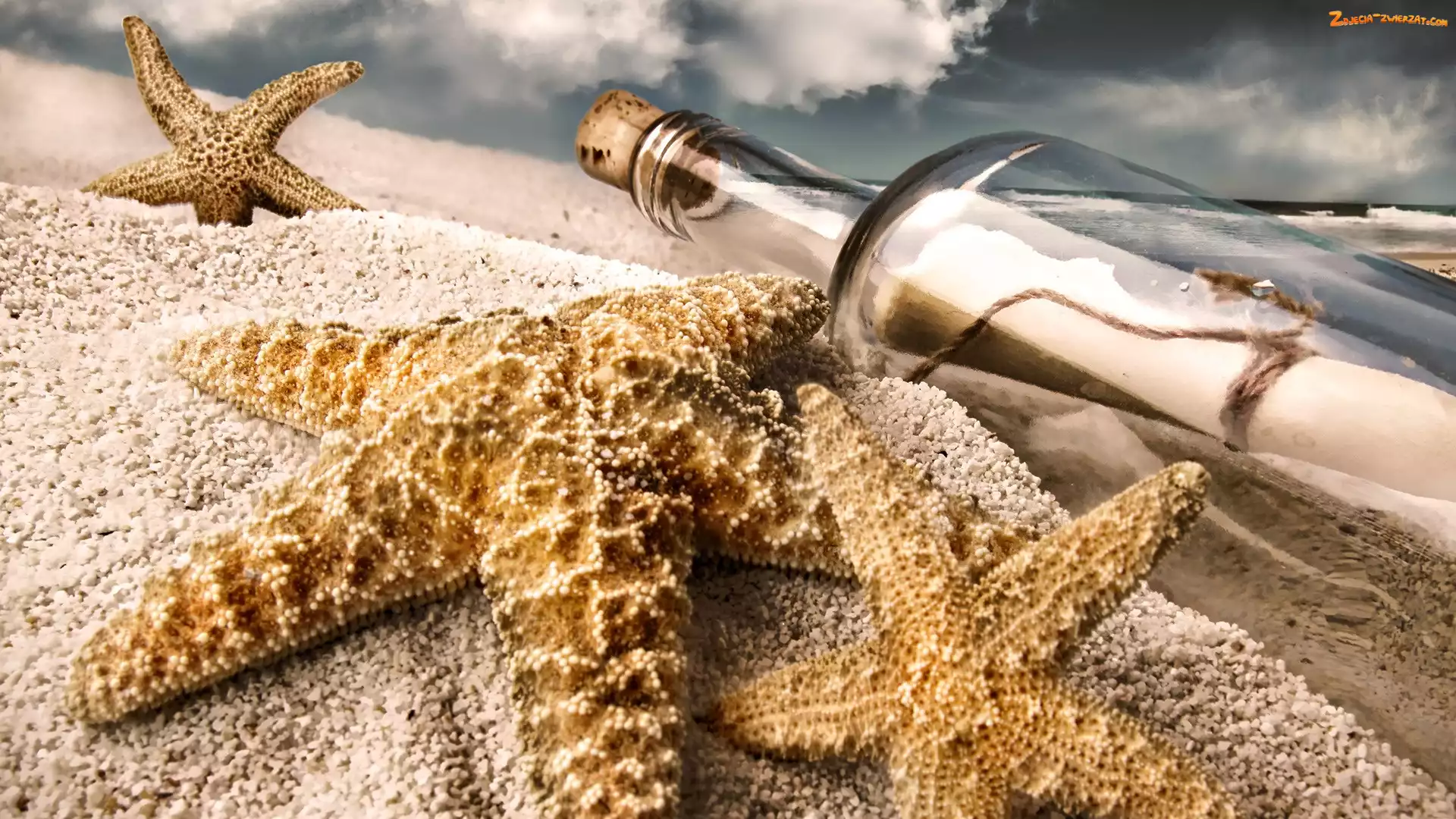 Zdjęcie: List, Butelka, Piasek, Plaża, Rozgwiazda