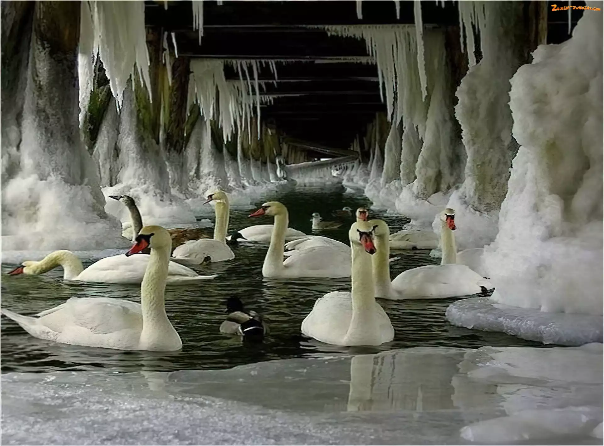 Zdjęcie: Lód, Łabędzie, Sople, Most
