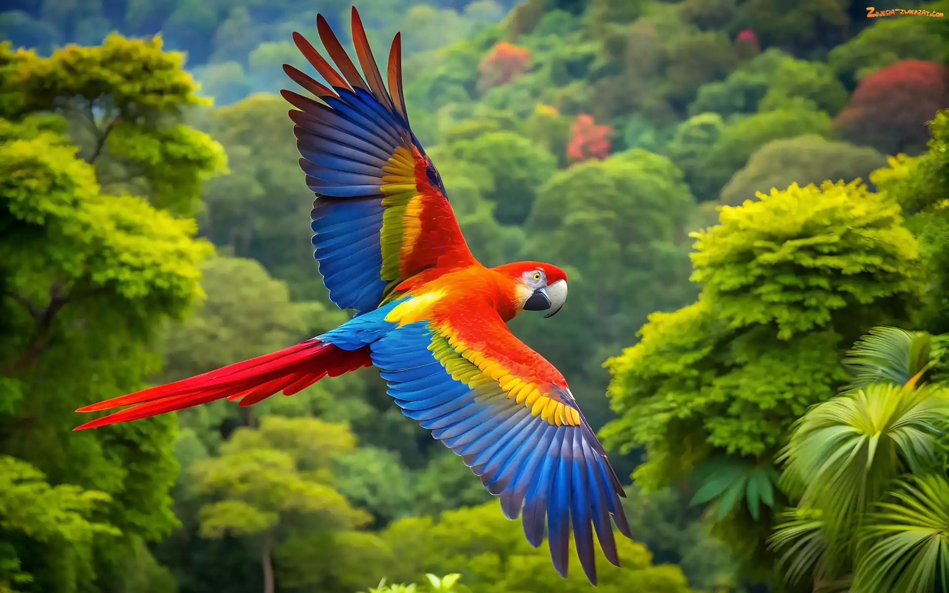 Zdjęcie: Drzewa, Lot, AI, Papuga, Ara