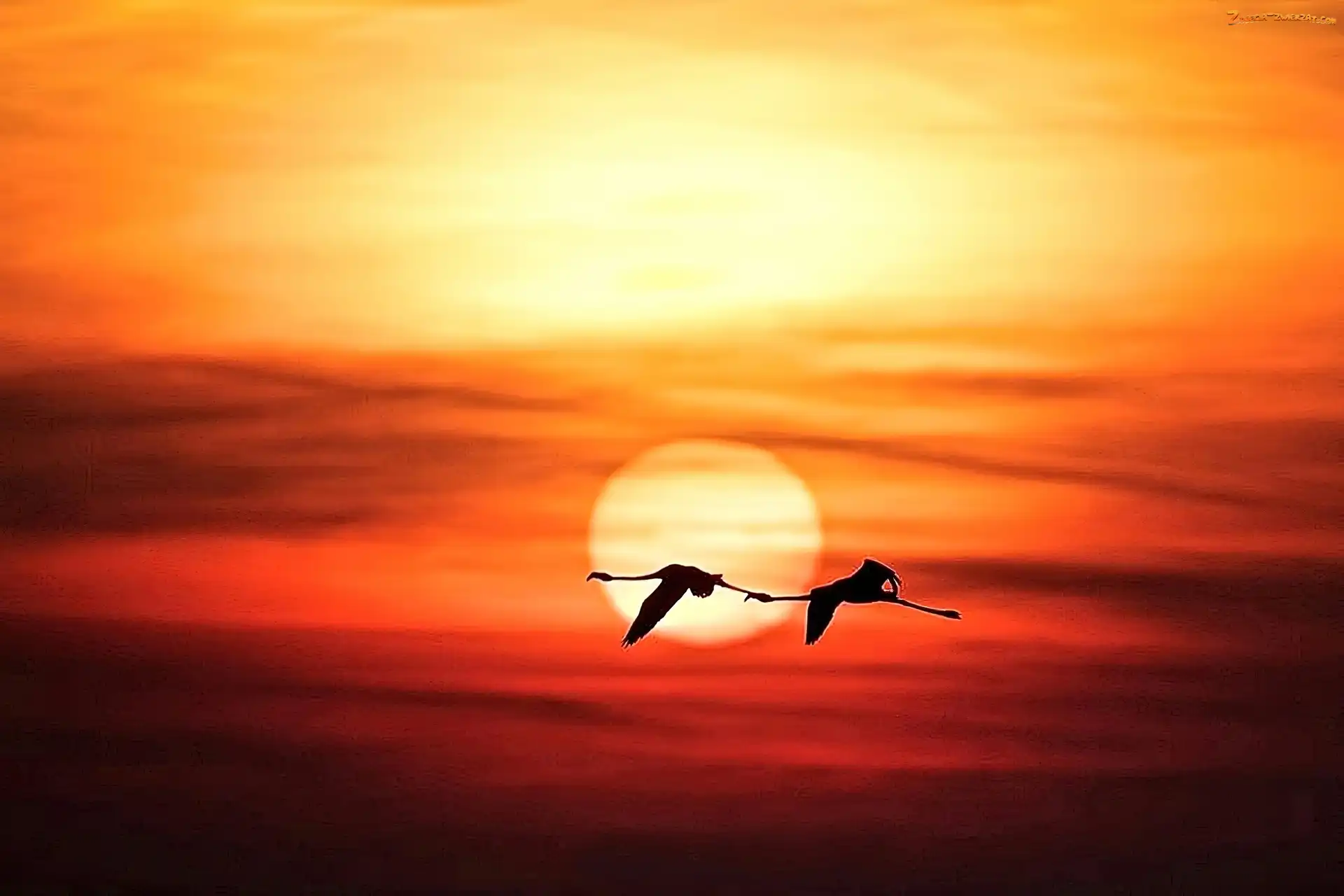 Zdjęcie: Lot, Słońca, Flamingi, Zachód