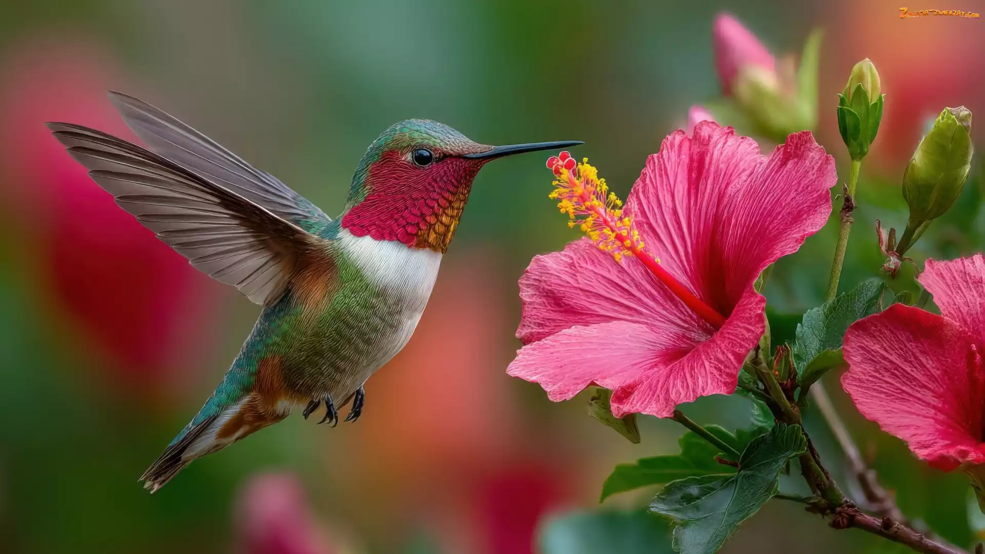 Zdjęcie: Lot, Koliber, Hibiskus, Grafika AI, Łodyga, Pąki, Kwiat, Ptak, Różowy