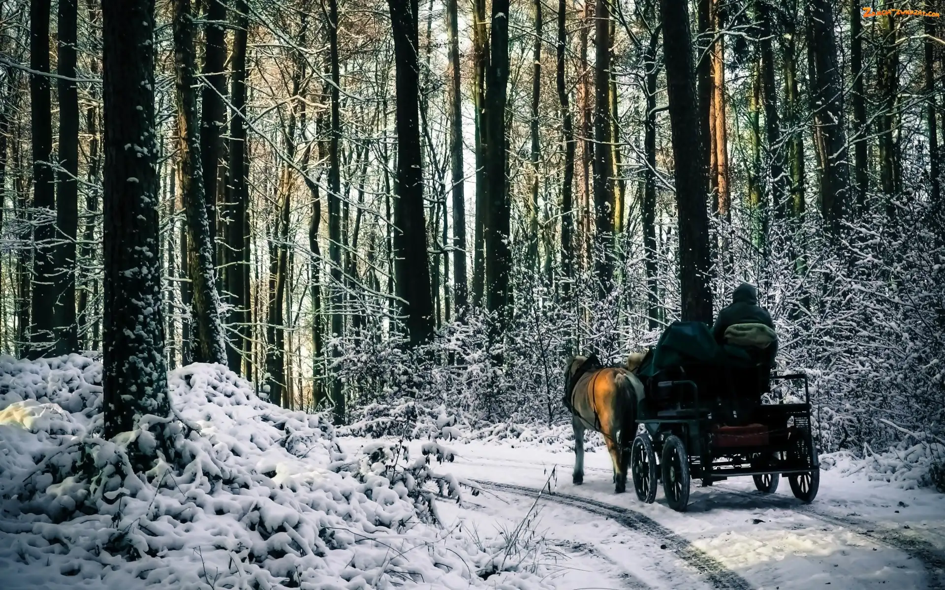 Zdjęcie: Ludzie, Las, Zima, Droga, Bryczka, Konie