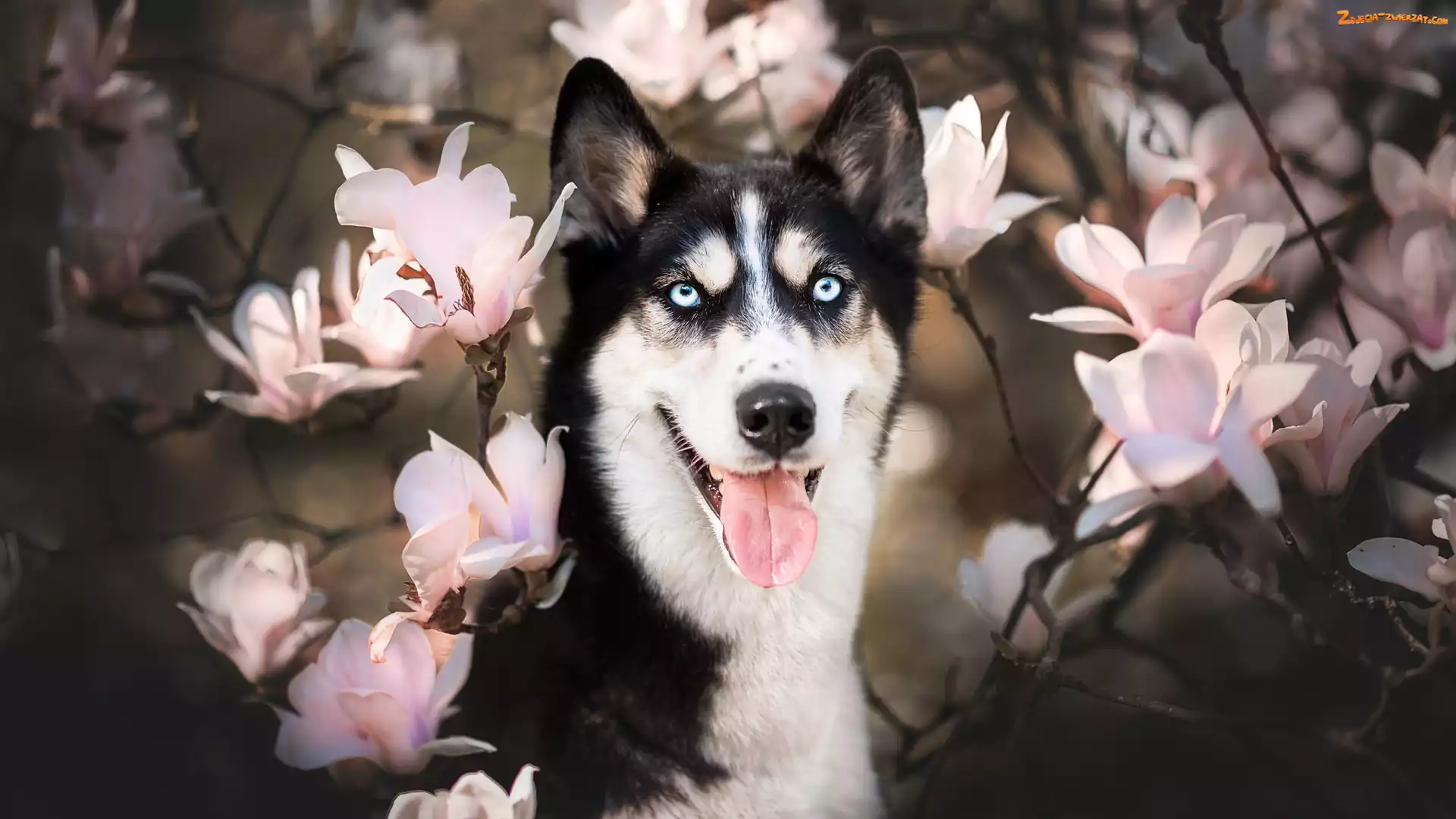 Zdjęcie: Magnolie, Kwiaty, Siberian husky, Pies, Mordka