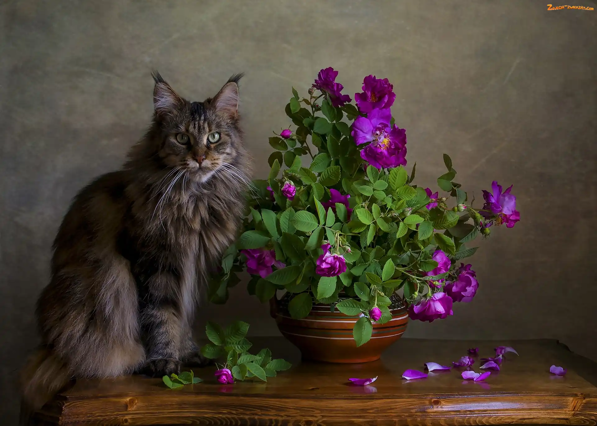 Zdjęcie: Maine coon, Donica, Kot, Róże