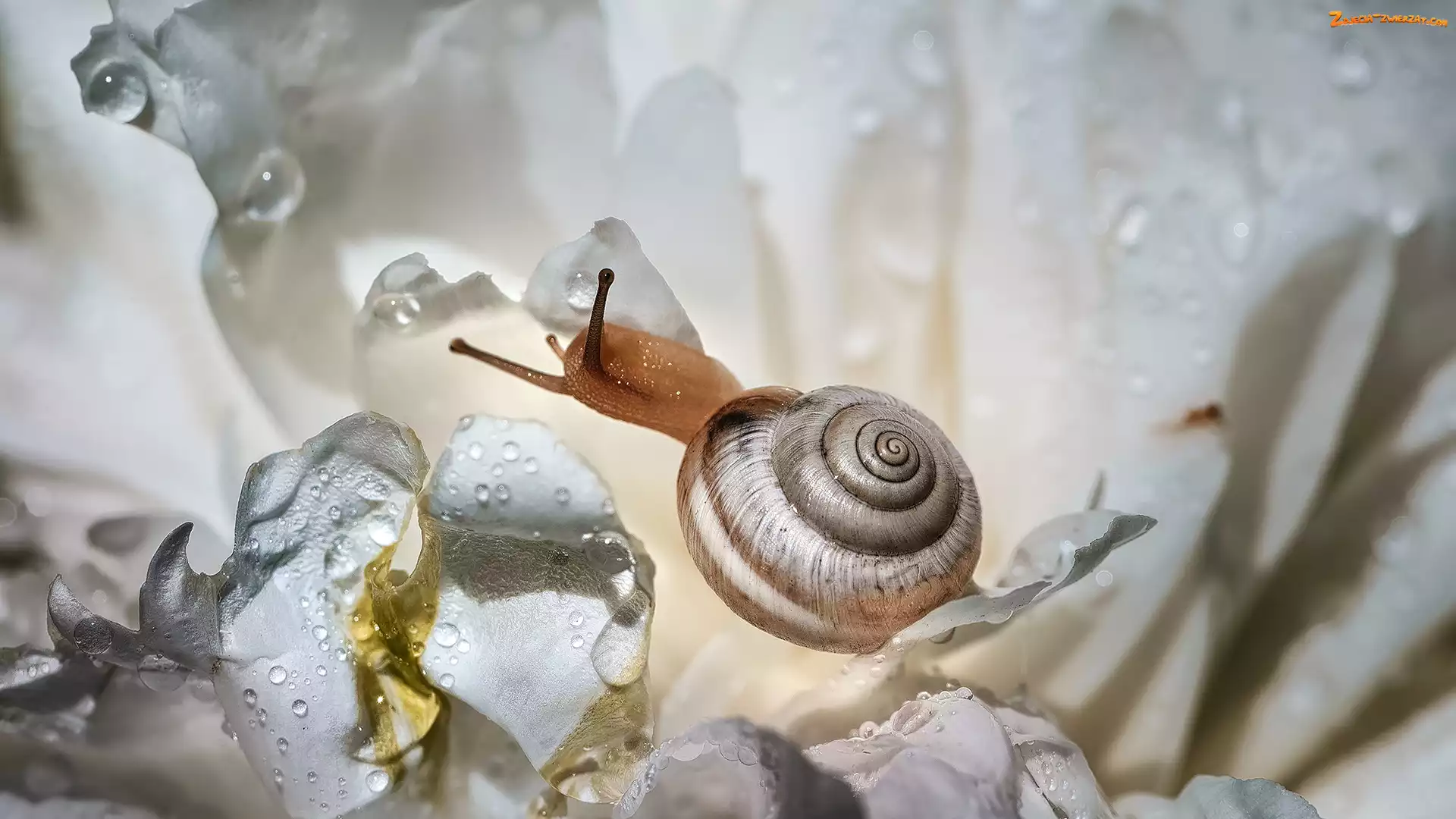 Zdjęcie: Makro, Ślimak, Kwiaty, Białe, Krople