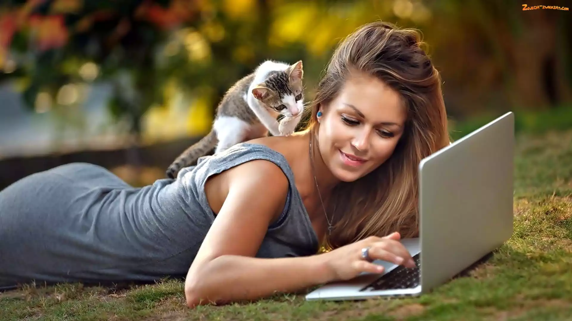 Zdjęcie: Mały, Laptop, Kobieta, Kotek