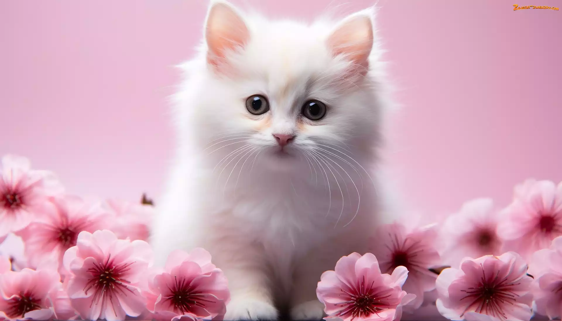 Zdjęcie: Grafika, Biały, Kot, Mały, Kwiaty, Różowe tło