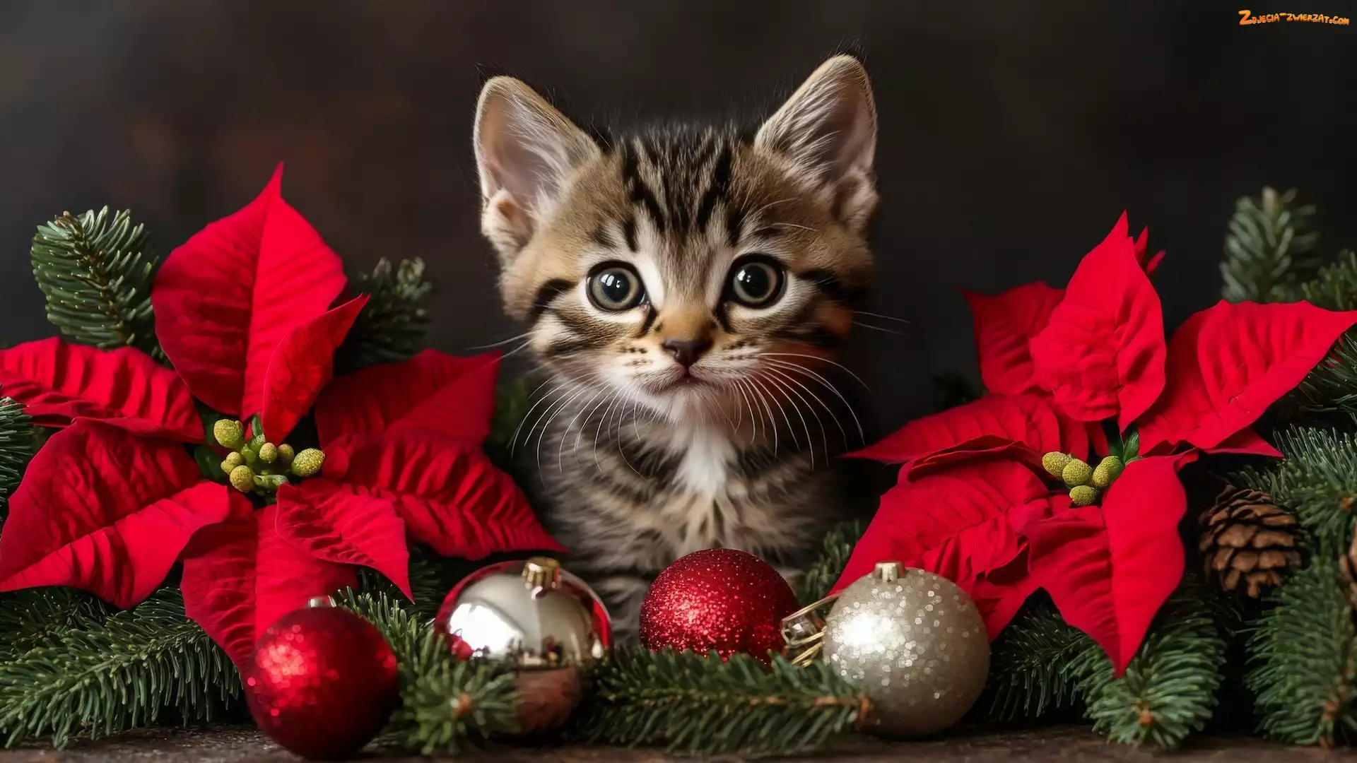 Zdjęcie: Bombki, Kotek, Kot, Mały, Kwiaty, Gwiazda betlejemska