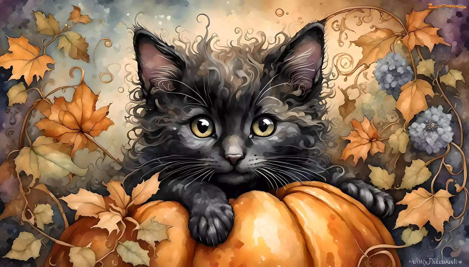 Zdjęcie: Grafika, Kot, Czarny, Mały, Dynia, Liście