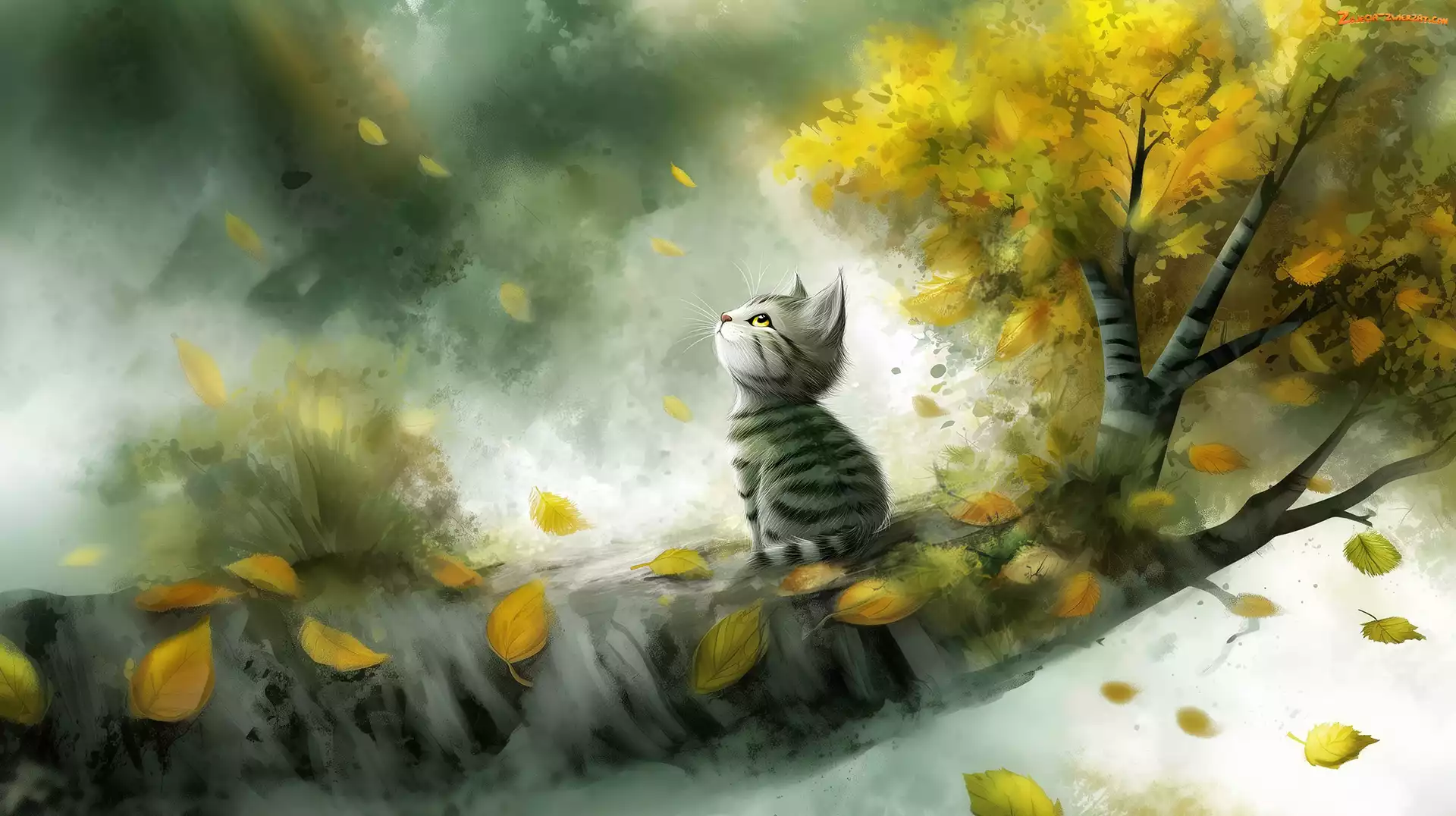Zdjęcie: Grafika AI, Szary, Mały, Kot, Drzewo, Liście
