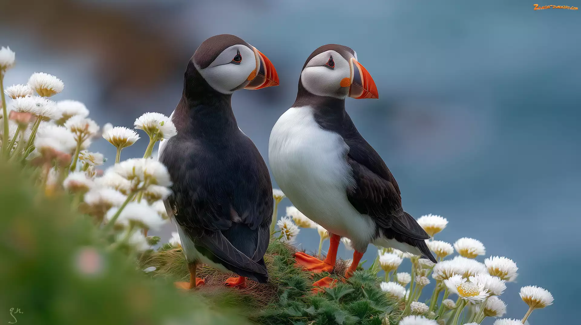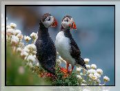 Grafika AI, Ptaki, Maskonury, Dwa, Białe, Kwiaty