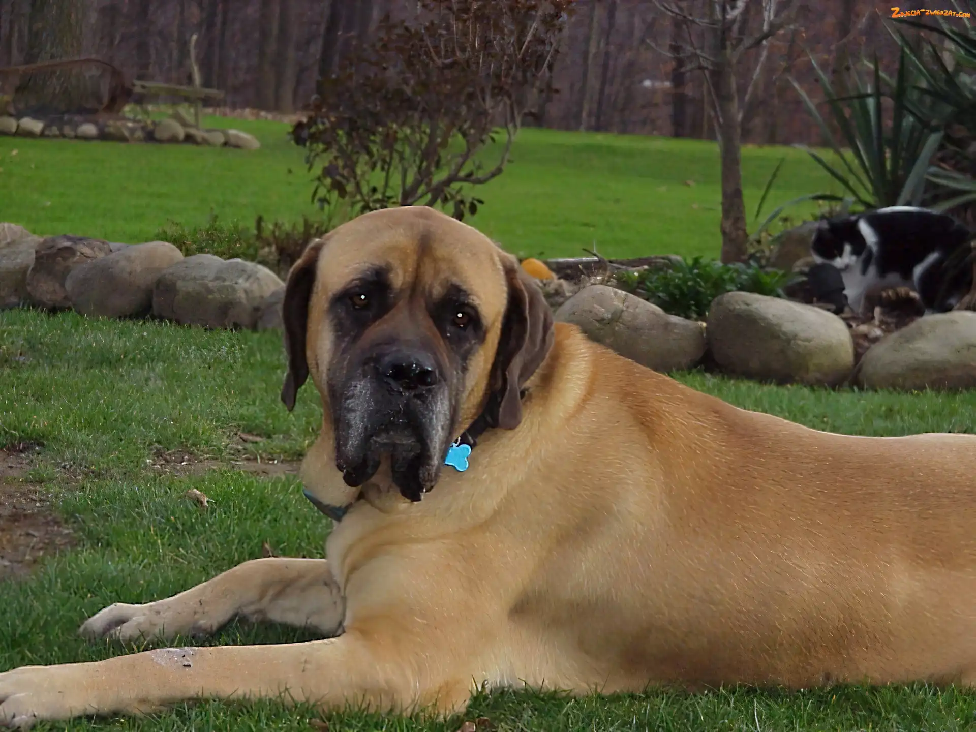 Zdjęcie: Mastiff, kot, Mastif angielski, ogród