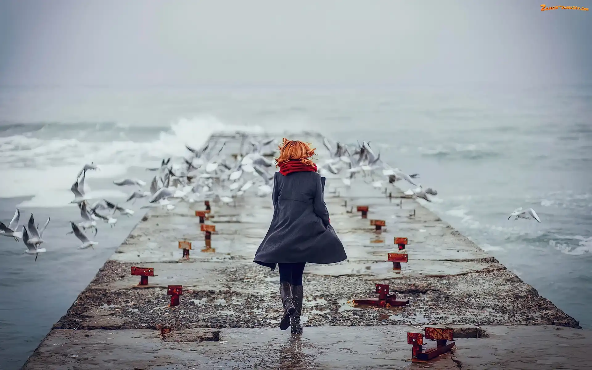 Mewy, Wiatr, Morze, Rudowłosa, Pomost