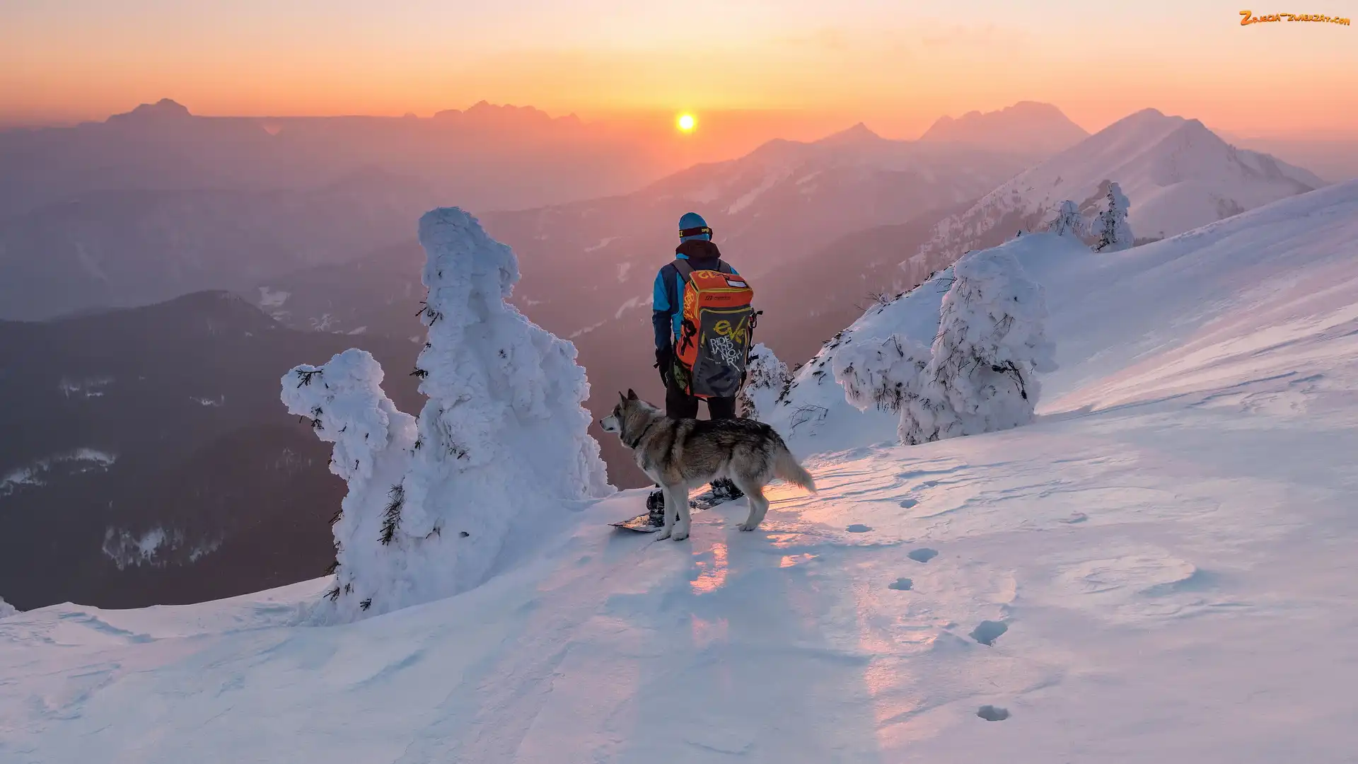 Zdjęcie: Zachód słońca, Drzewa, Góry, Pies, Snowboardzista, Ośnieżone, Zima, Mężczyzna