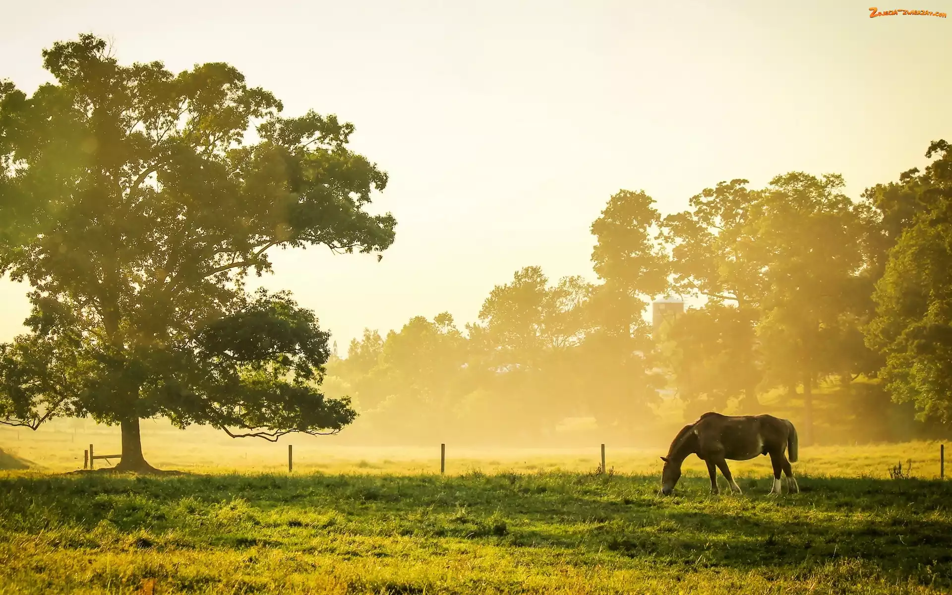 Zdjęcie: Mgła, Koń, Łąka, Drzewo