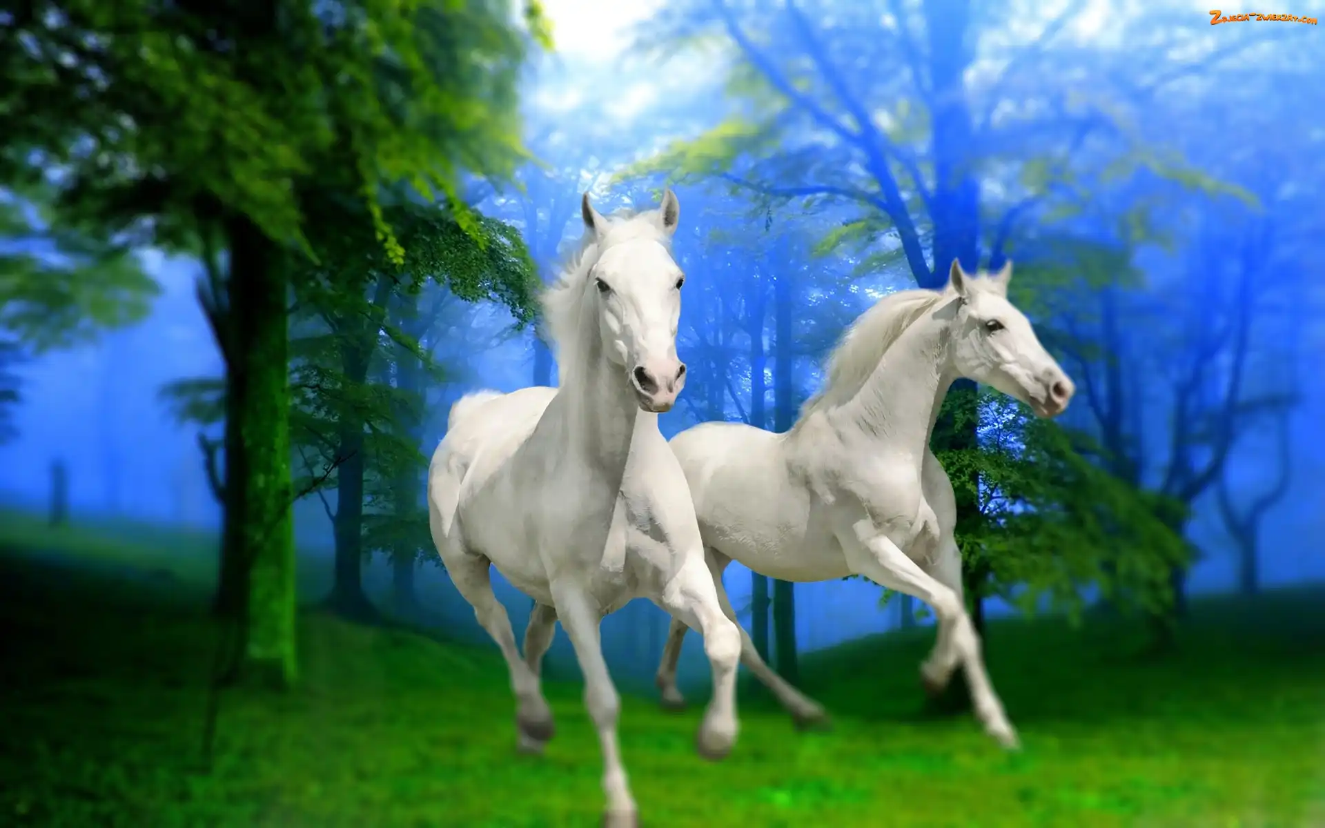 Zdjęcie: Mgła, Drzewa, Konie, Białe, Las