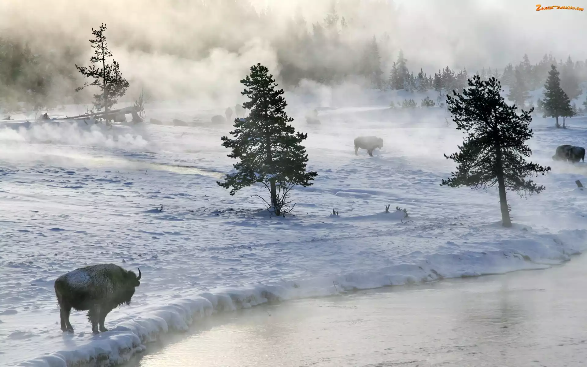 Zdjęcie: Mgła, Śnieg, Rzeka, Bizony, Drzewa