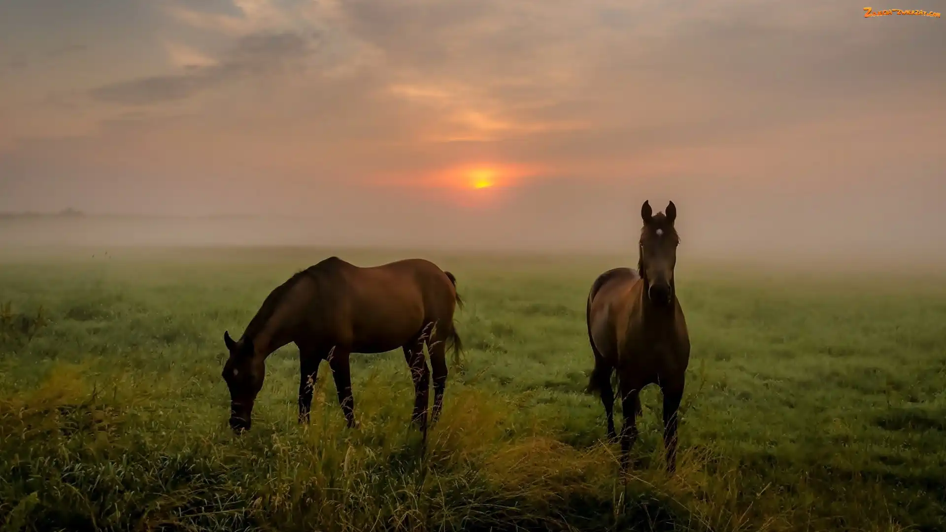 Zdjęcie: Mgła, Zachód Słońca, Konie, Dwa, Pastwisko