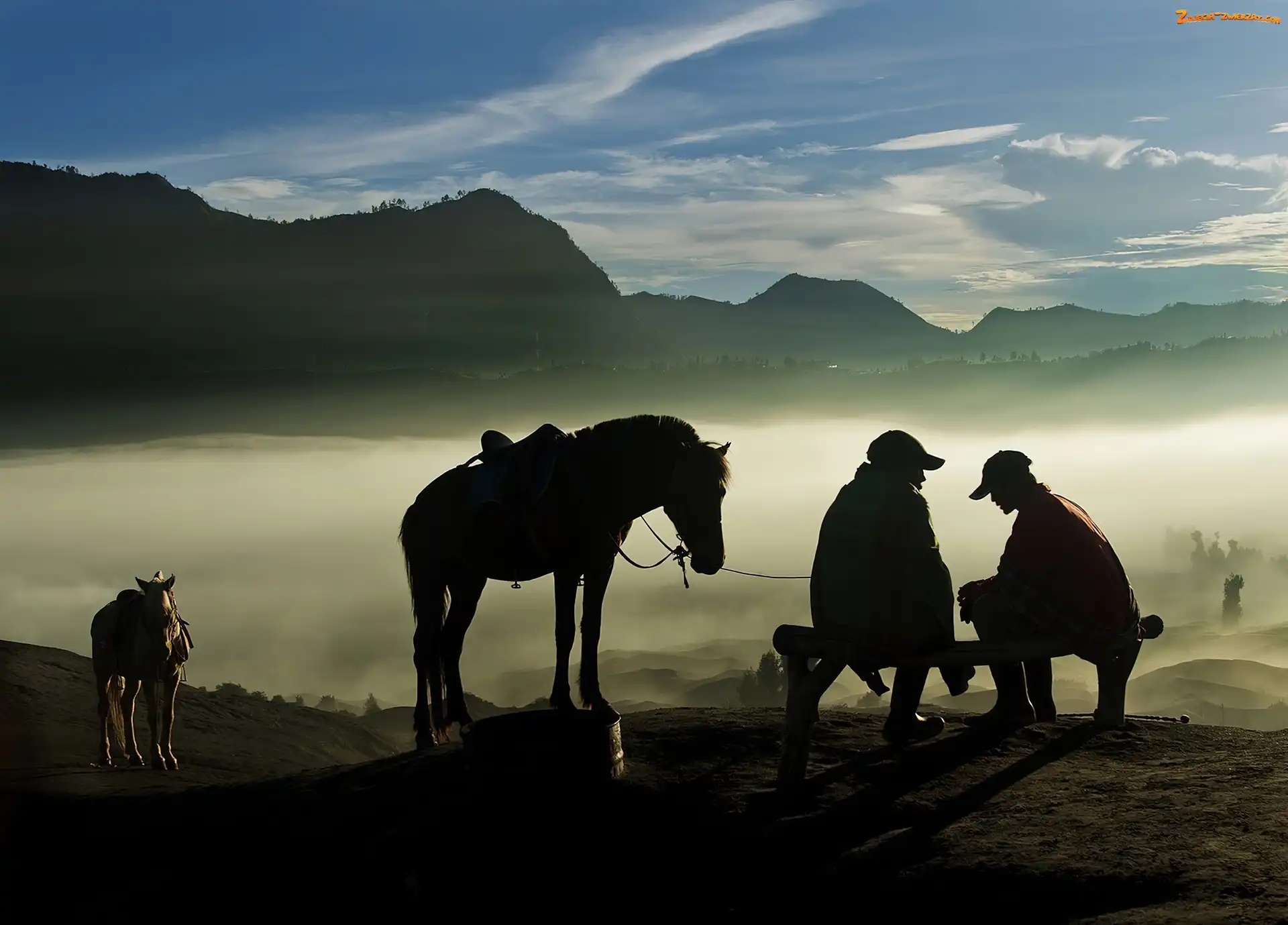Zdjęcie: Mgła, Ludzie, Góry, Konie