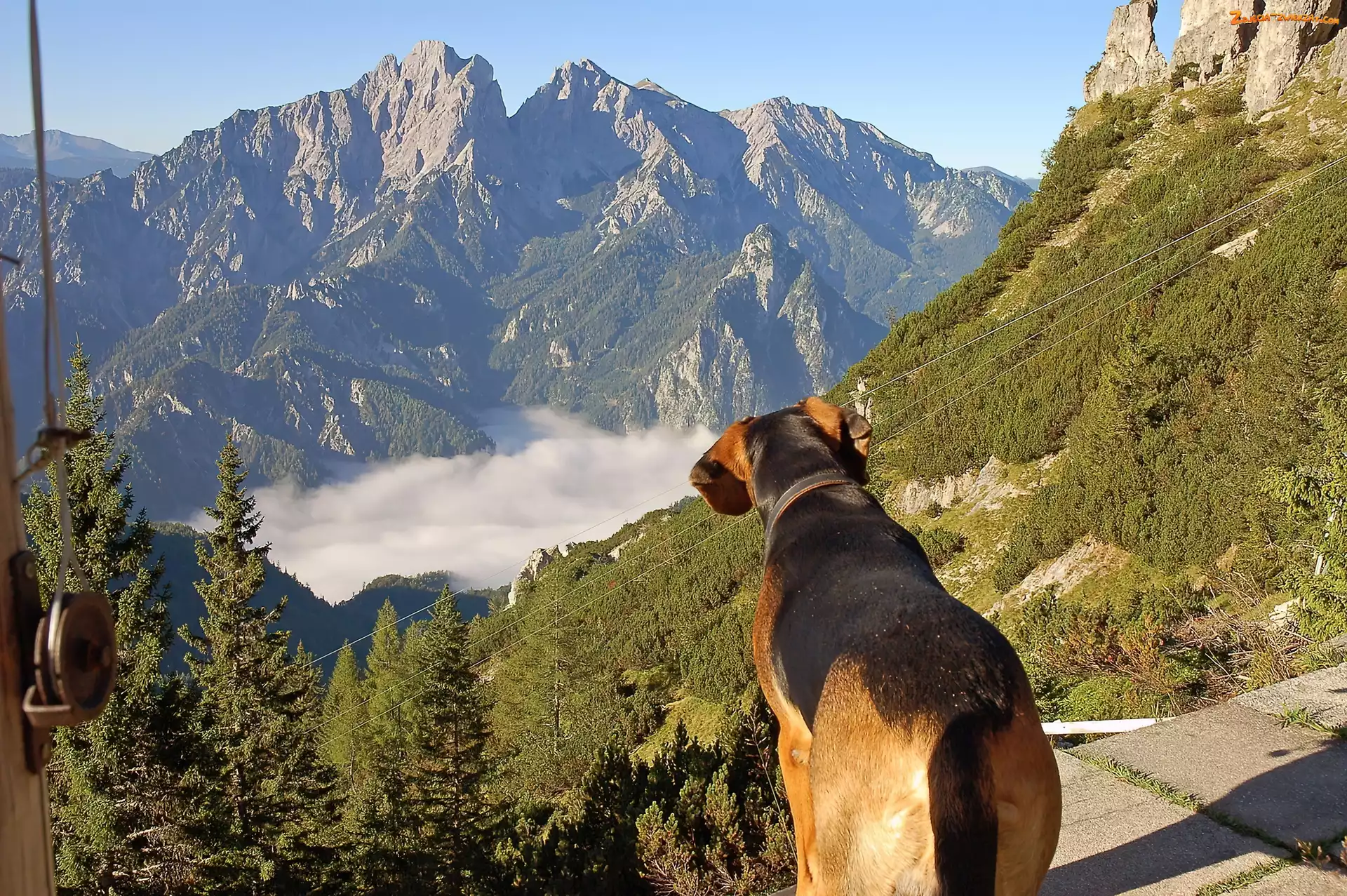 Zdjęcie: Mgła, Piesek, Góry, Drzewa