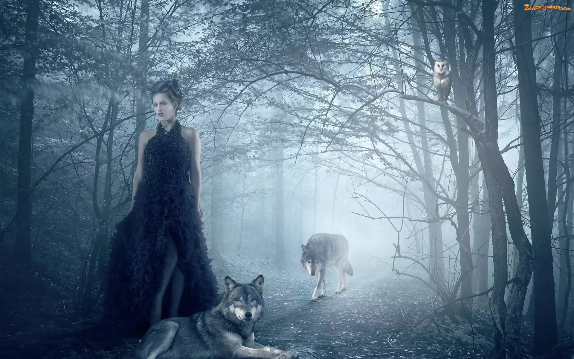 Zdjęcie: Mgła, Sowa, Las, Kobieta, Wilki