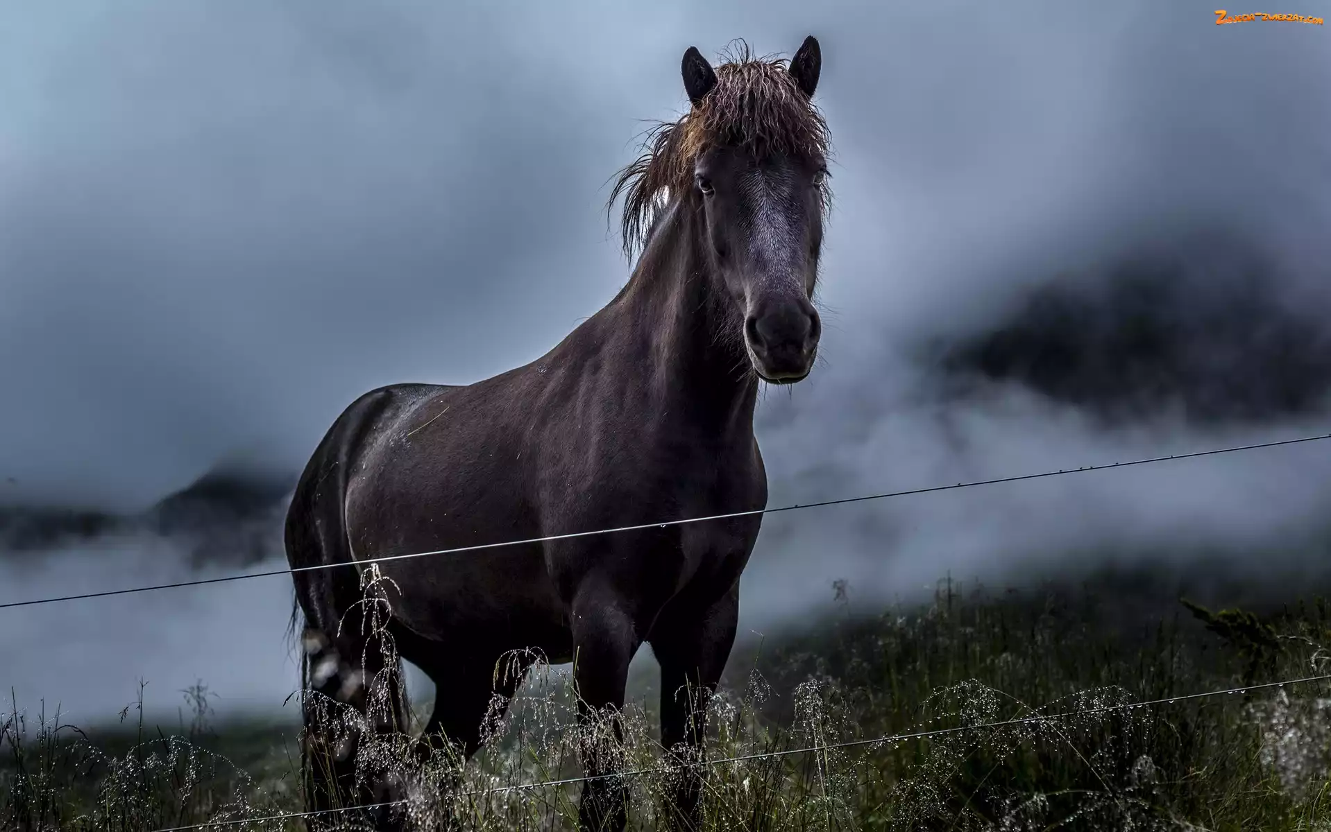 Zdjęcie: Mgła, Trawa, Ogrodzenie, Koń, Łąka