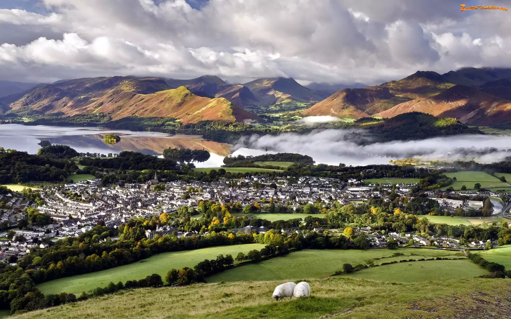 Zdjęcie: Owce, Mgła, Góry, Miasto, Pastwiska, Chmury, Jezioro