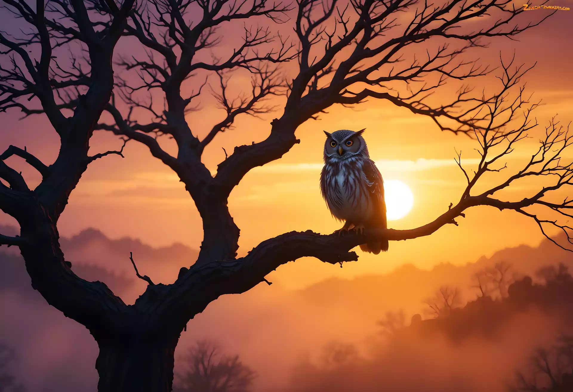 Zdjęcie: Zachód słońca, Drzewo, Mgła, Sowa, Puchacz