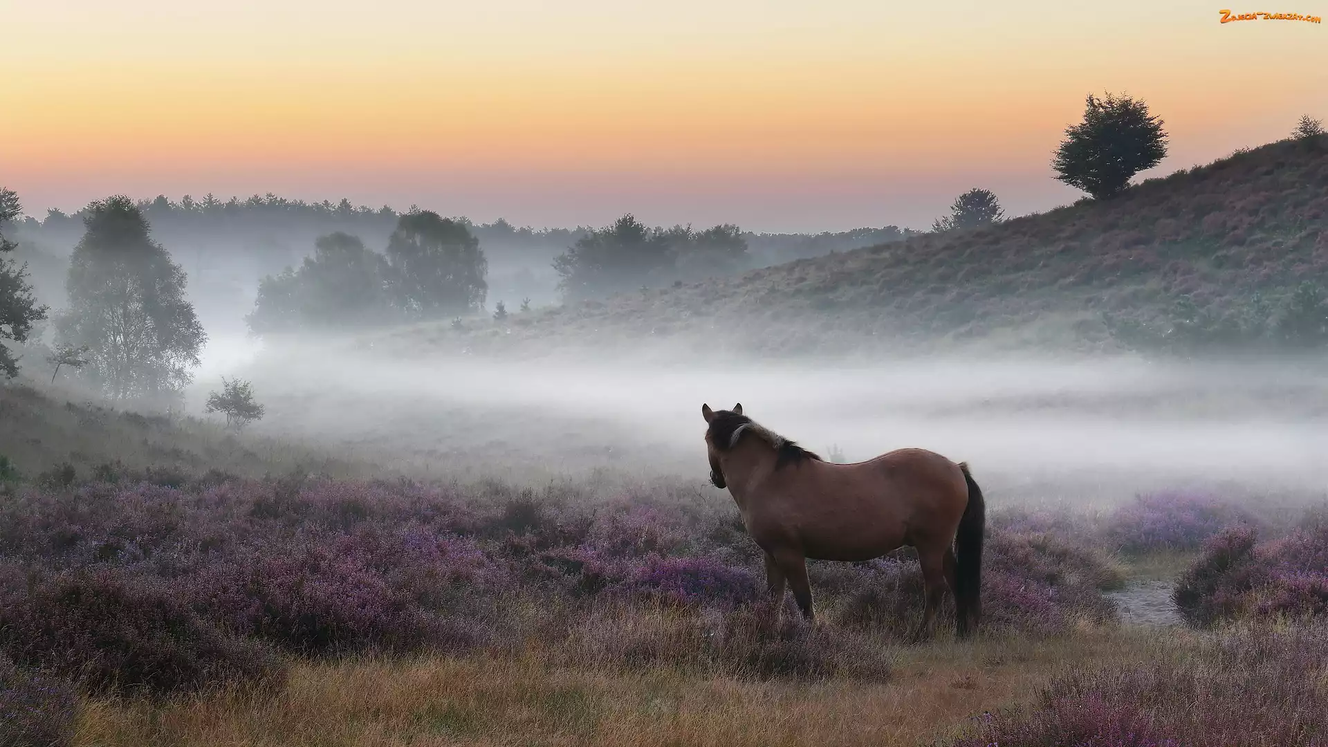 Zdjęcie: Mgła, Koń, Wrzosowisko, Drzewa