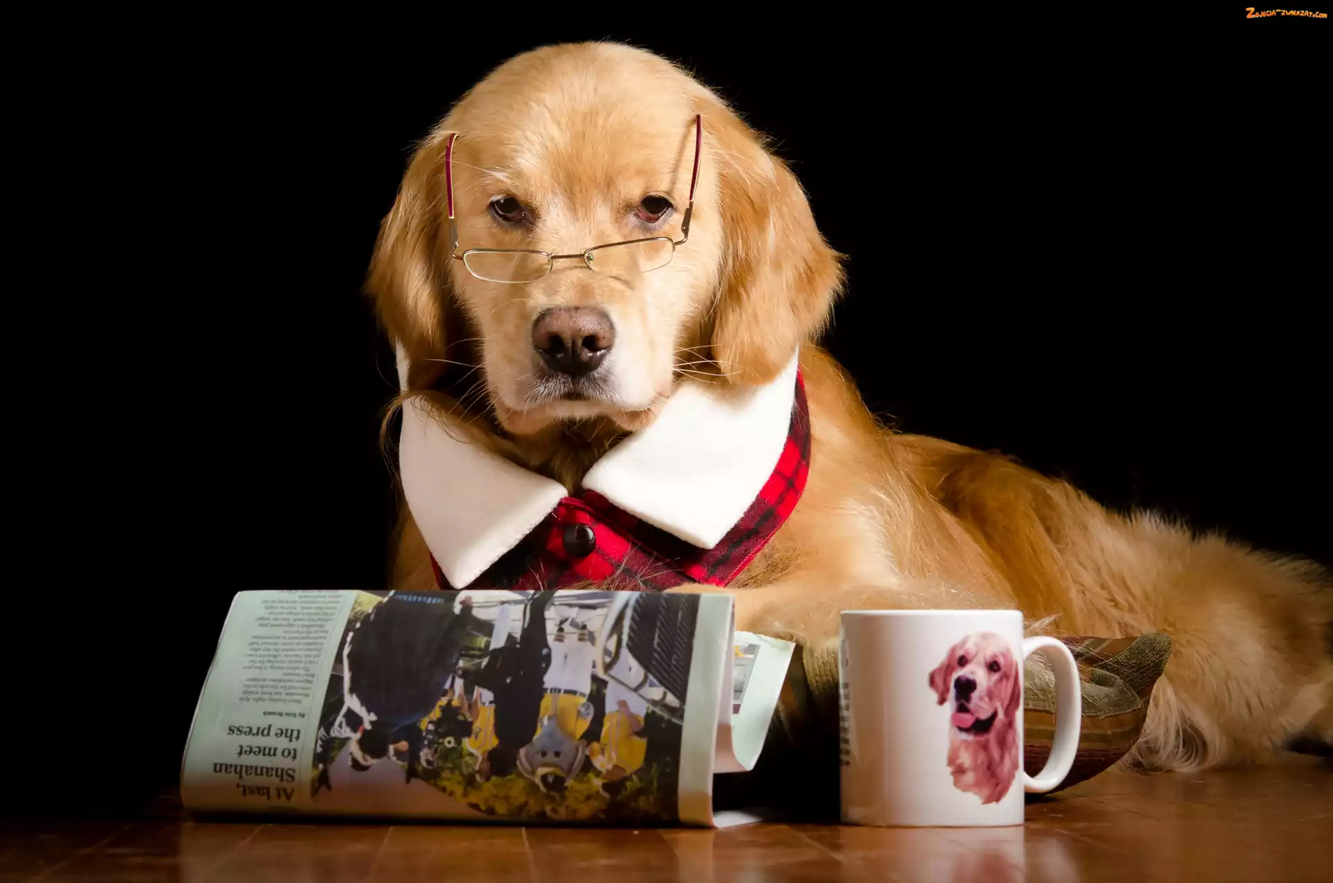 Zdjęcie: Śmieszne, Kubek, Okulary, Golden Retriever, Gazeta