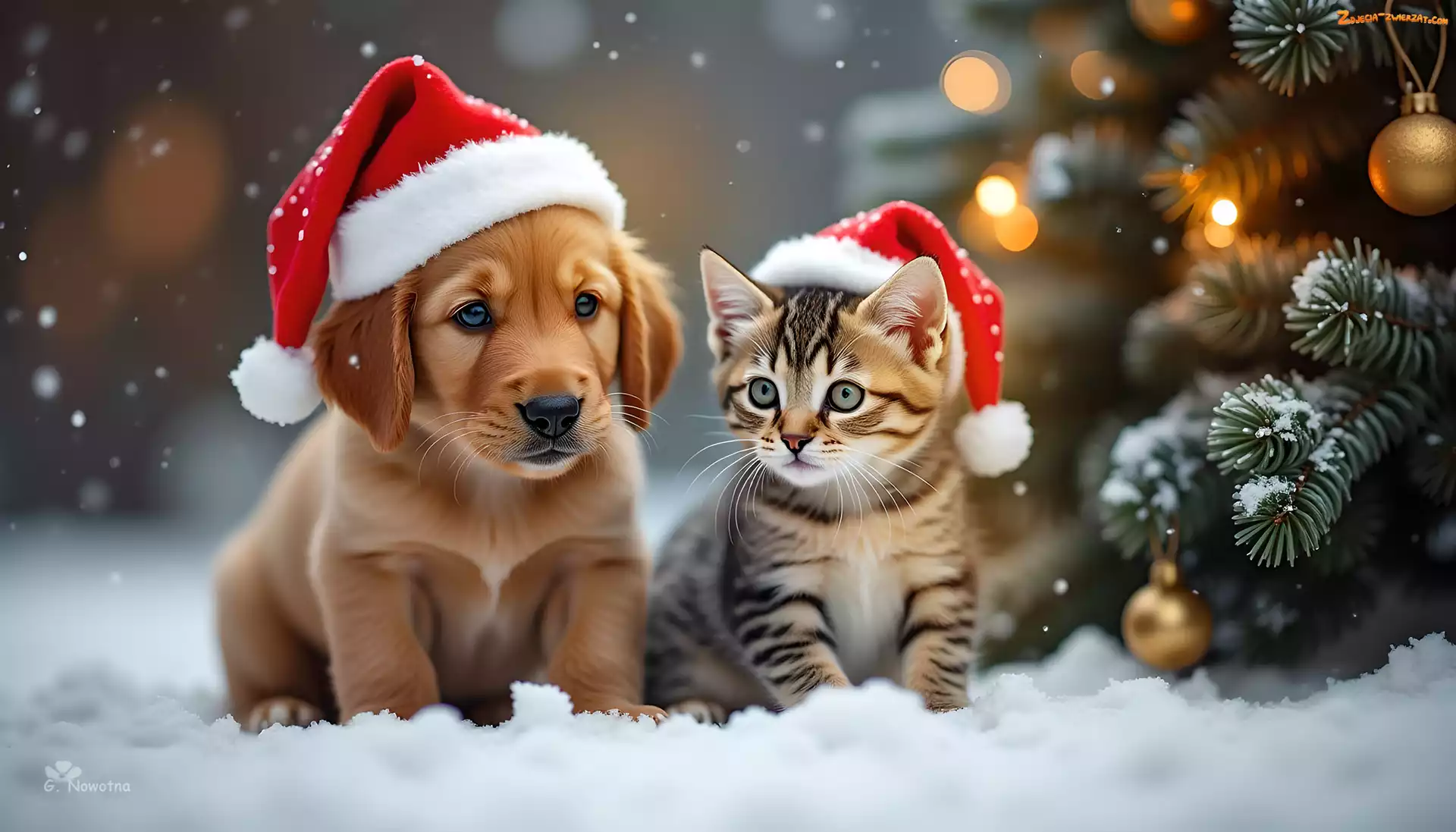 Zdjęcie: Choinka, Szczeniak, Kot, Mikołaja, Grafika, Czapki, Śnieg