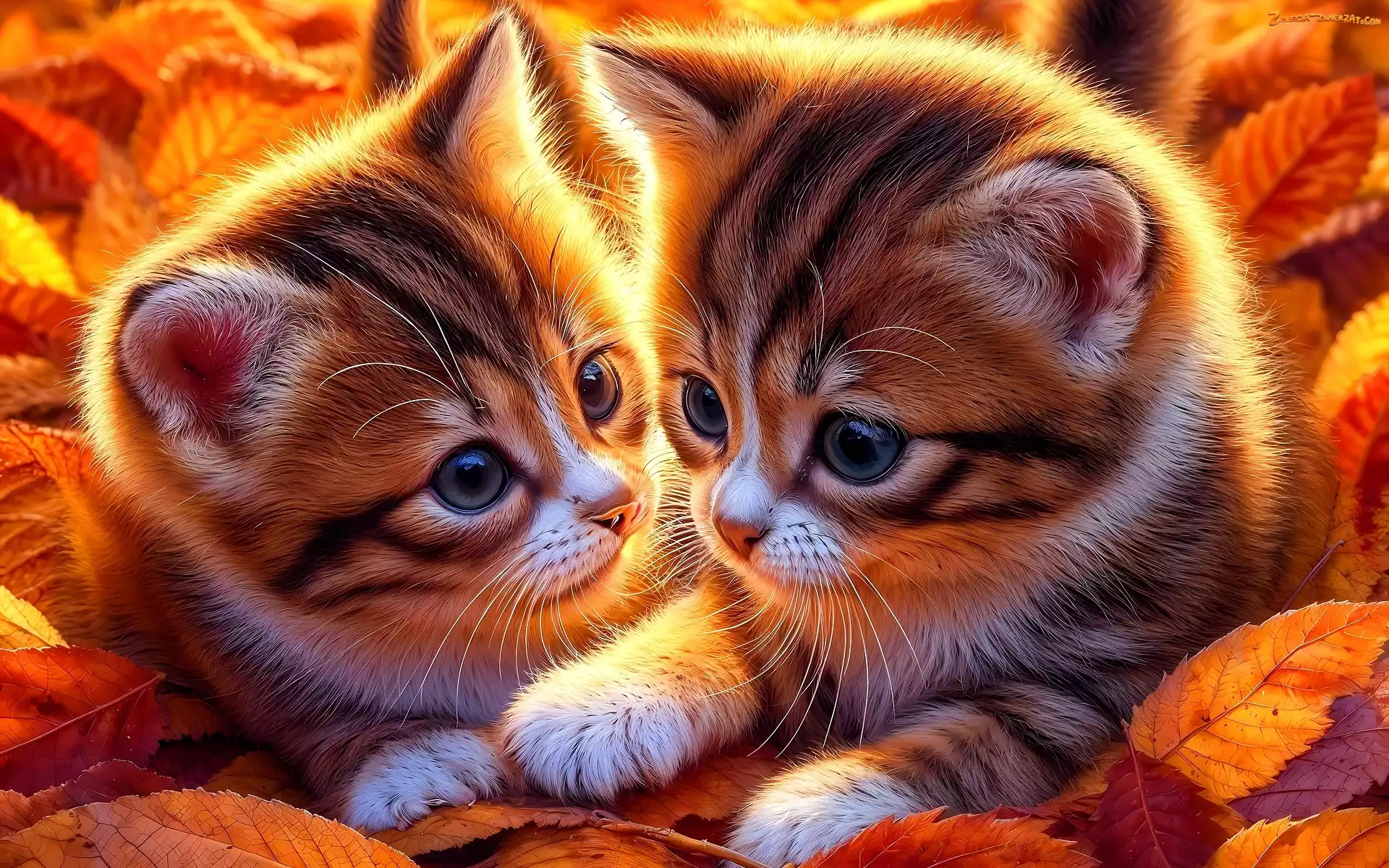 Zdjęcie: Grafika, Koty, Dwa, Młode, Żółte, Liście