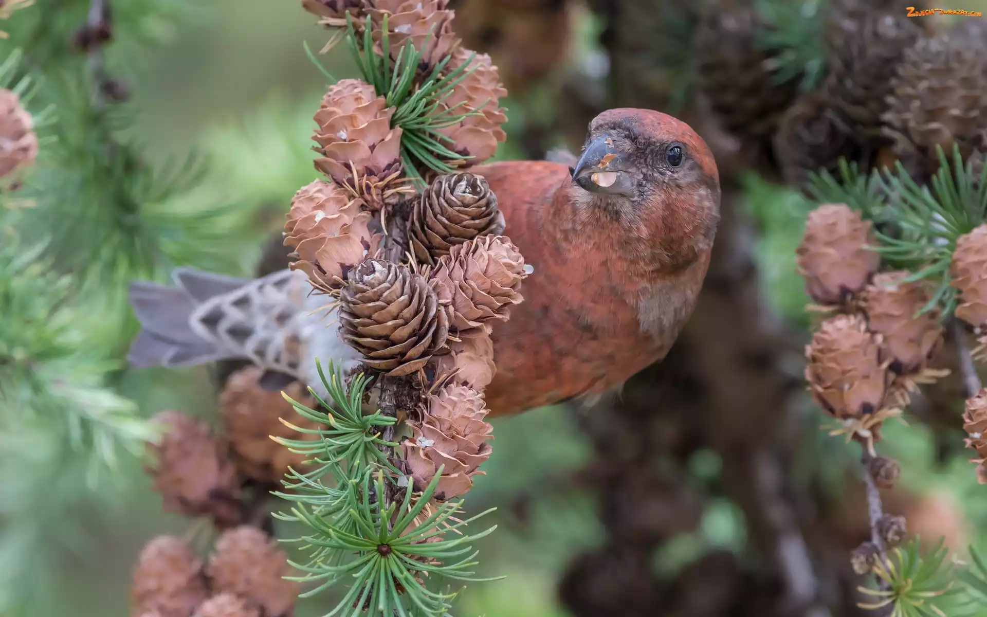 Zdjęcie: Modrzew, Szyszki, Krzyżodziób świerkowy, Ptak, Gałązka
