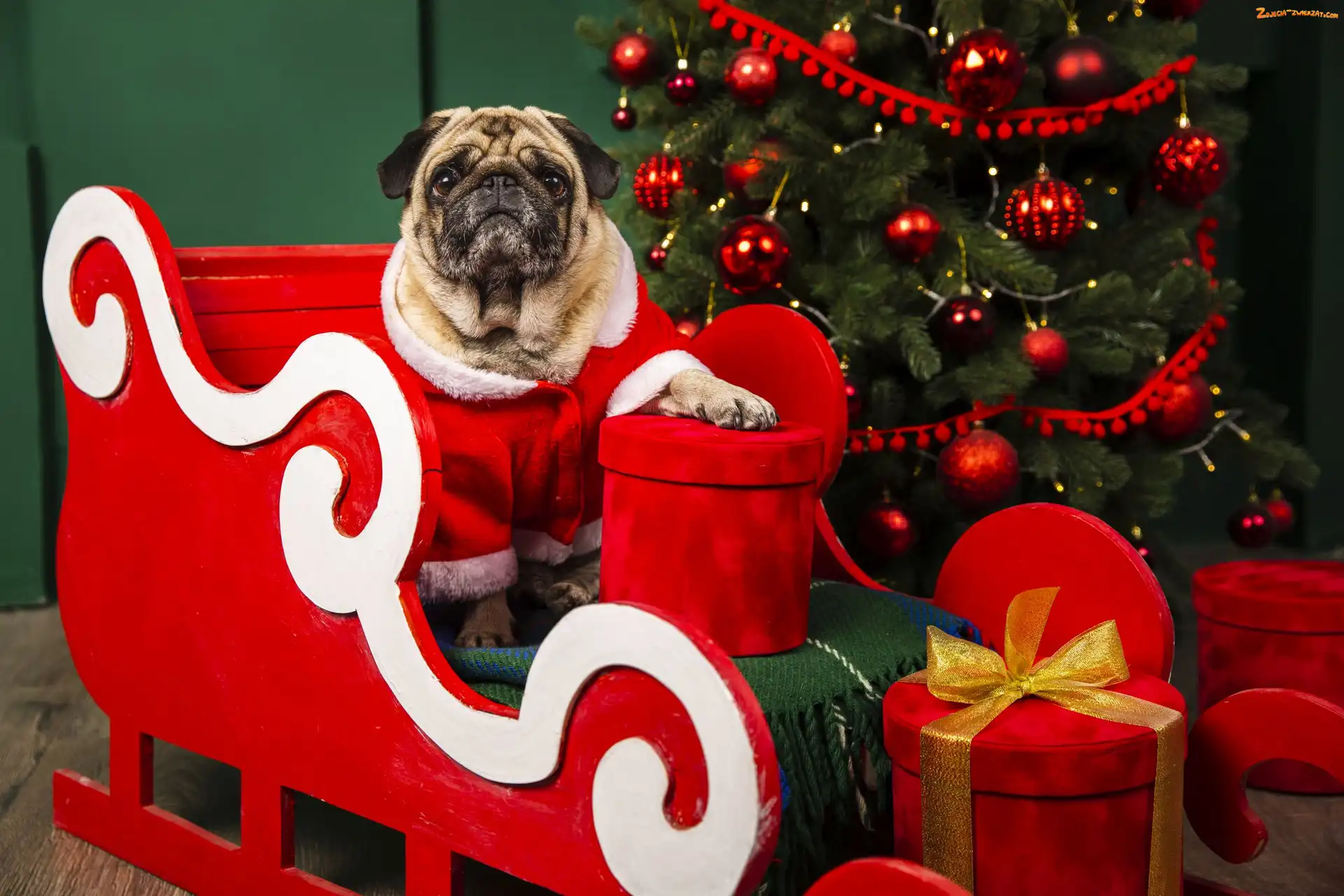 Zdjęcie: Bobki, Mops, Sanie, Prezenty, Choinka, Pies, Kubraczek